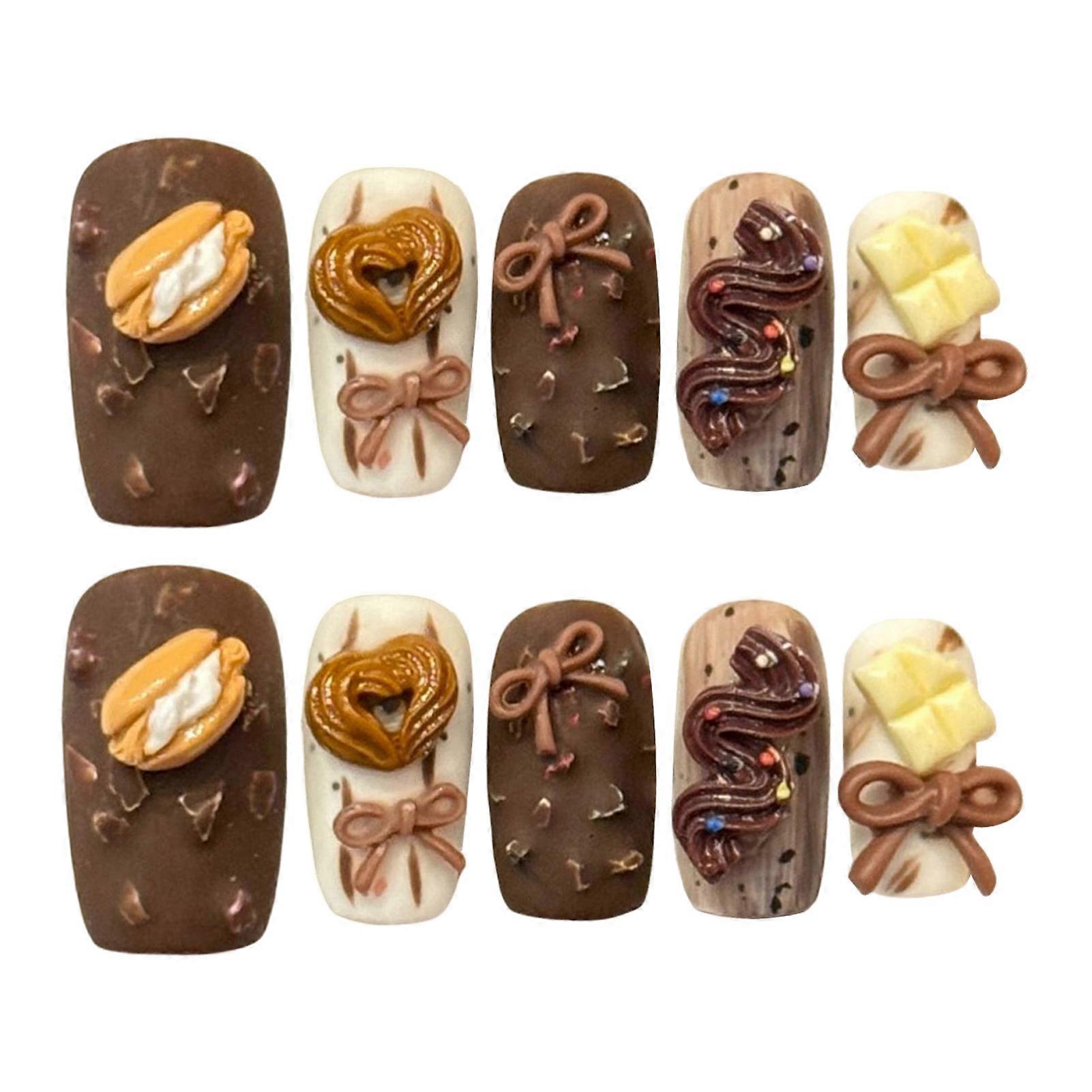 10PCS Chocolate Fake Nails with Cute Ice Cream Decor Artificial Nails for