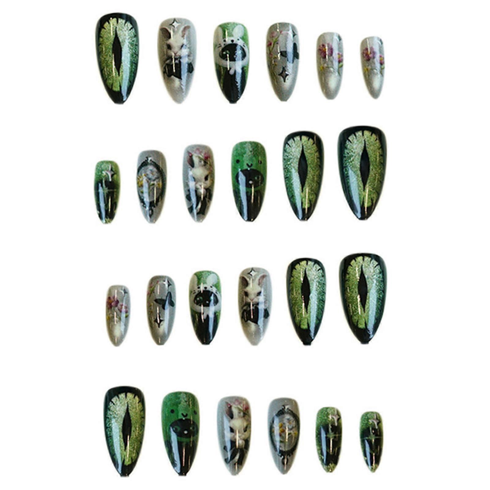 24 Pcs Almond Shape Fake Nails Black Cat Eye Design With Bunny Print Pre Cut