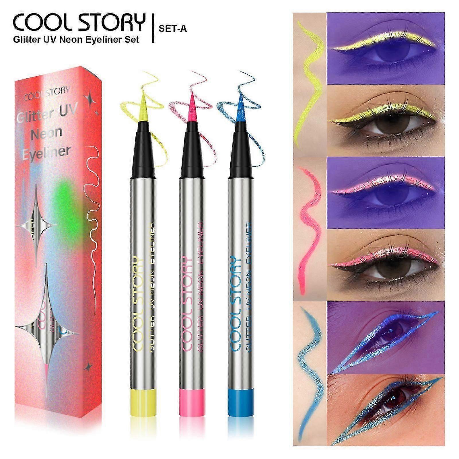 3 Colors UV Neon Liquid Eyeliner Colorful Waterproof Eyeliners Pen for Festival Makeup Smudge-proof Pigmented Liners Face Paint Pens for Festivals,