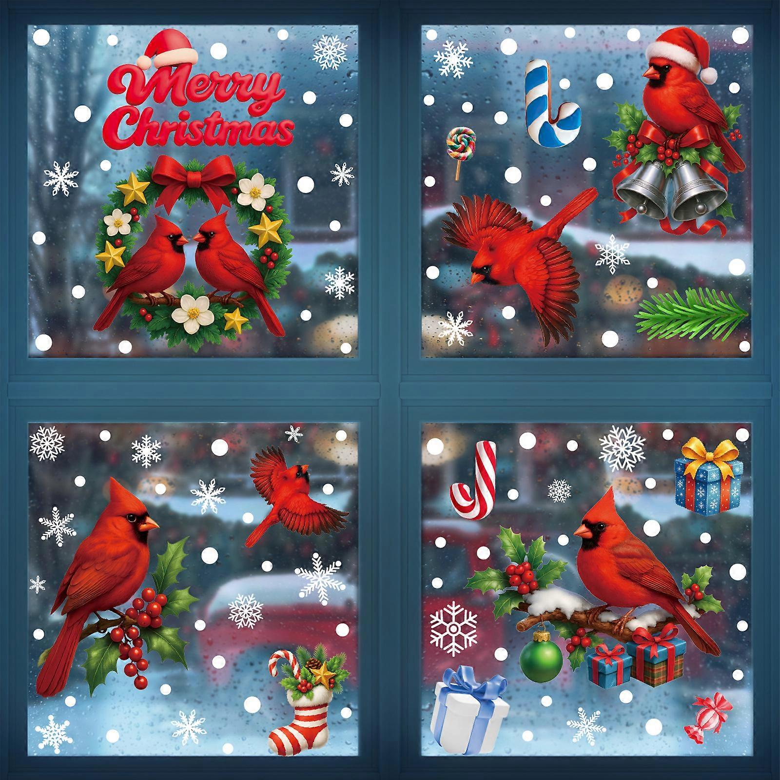 Christmas Window Decorative Anti-static Sticker Cardinal Bird Window Sticker Christmas Wreath Gift Anti-collision Glass Sticker [4 Combinations] BQ
