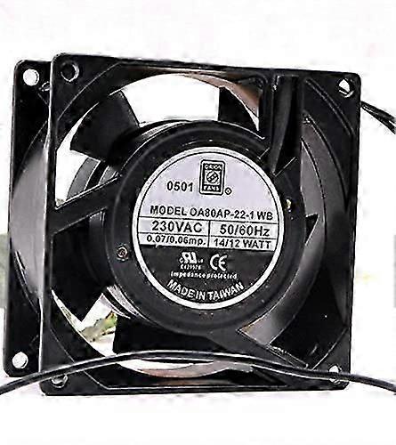 Description 1. OA80AP-22-1 WB fan 230V 0.07/0.06A 14/12W 808038mm axial fan 2. Fan model: OA80AP-22-1 WB 3. Size: 808038MM, voltage: 230V, current: 0.07/0.06A, power: 14/12W 4. Original accessories solve machine problems