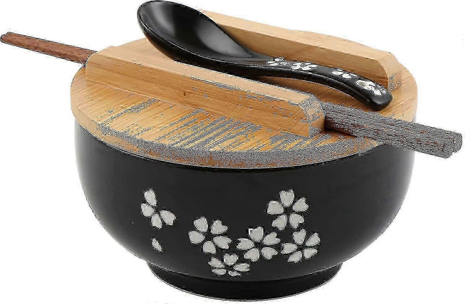 Ramen Bowl Set, Ramen Noodle With Lid Spoon, Large Ceramic Soup Bowl, Black Hand Drawn Rice Bowl Retro