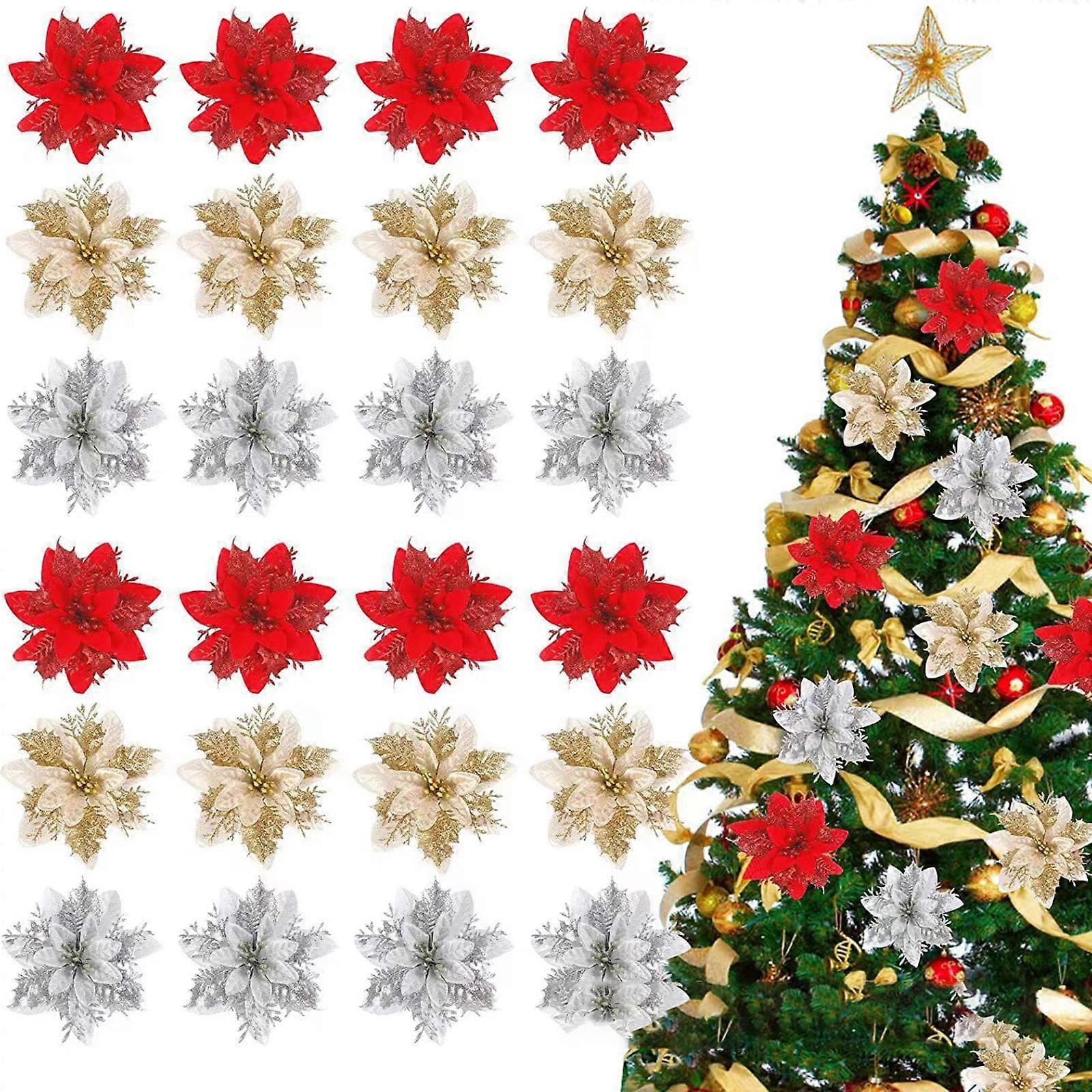 15Pcs Glitter Christmas Poinsettia Artificial Xmas Flower Ornaments Flowers Decor with Clips and Stems Christmas Tree Ornaments