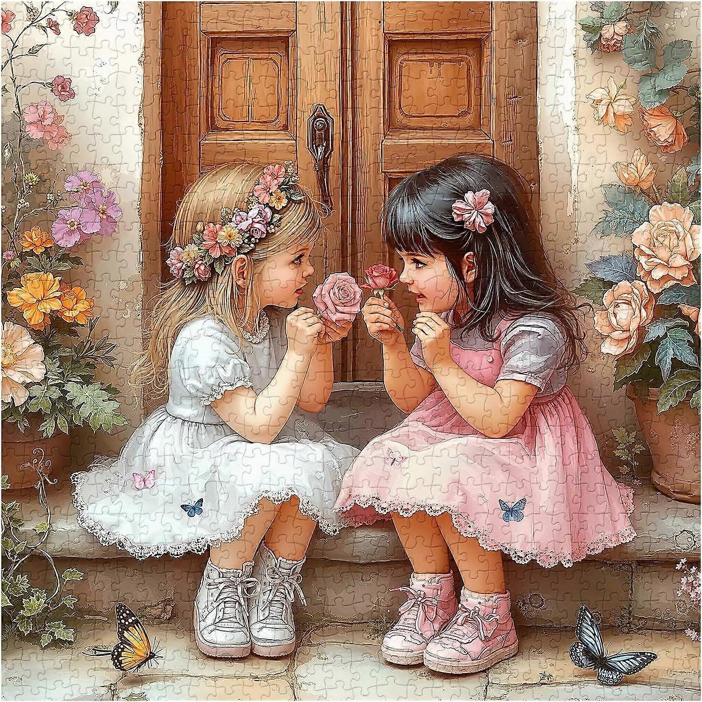 Sweet Flower Crown Girl Sharing Roses Puzzles for Adults Vintage Door Flower Aesthetic Jigsaw Puzzle, Challenging Floral Garden Scene with Butterfly P