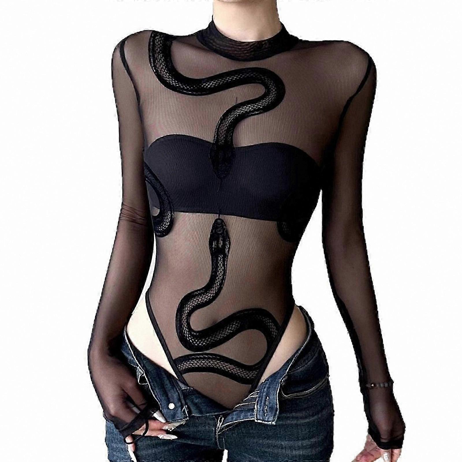 Sheer Mesh Long Sleeve Bodysuit for Women - Snake Print See-Through Leotard Top for Clubwear
