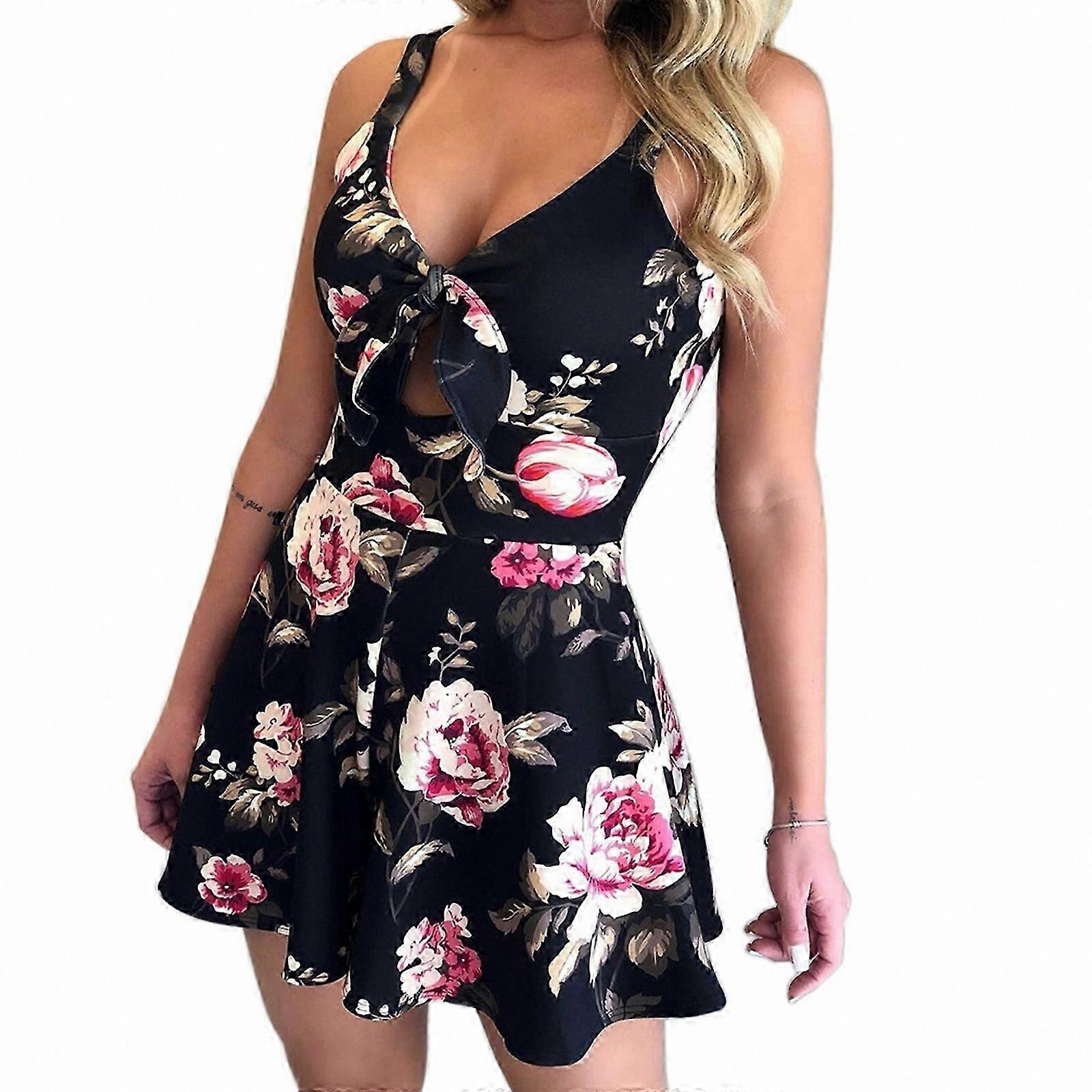 Women's Sleeveless V-Neck Bodysuit with Tie Front and Wide Leg Shorts Printed Tunic Waist Jumpsuit
