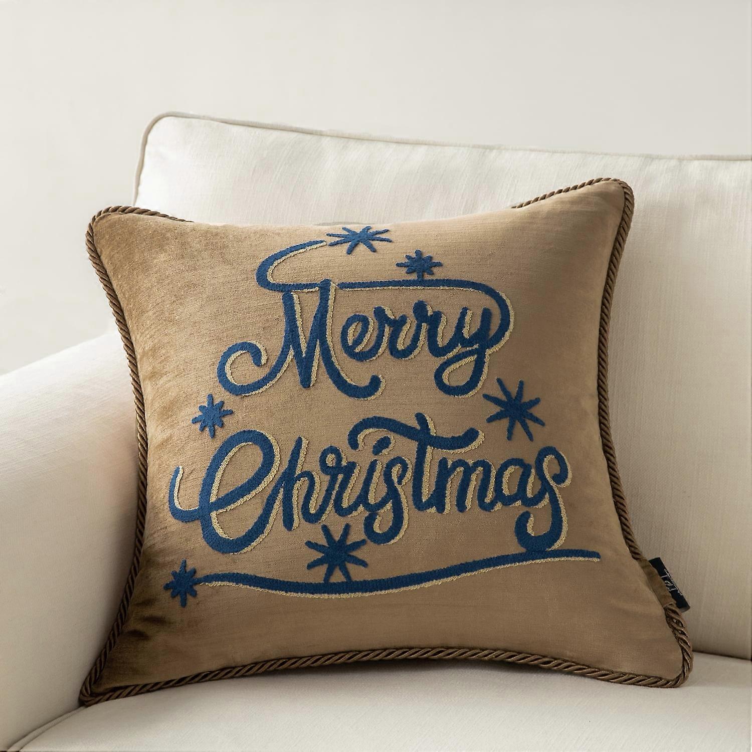 Phantoscope Christmas Embroidered Letters Cotton Cut Velvet Throw Pillow Cover, 18" x 18", Light Coffee, 1 Pack