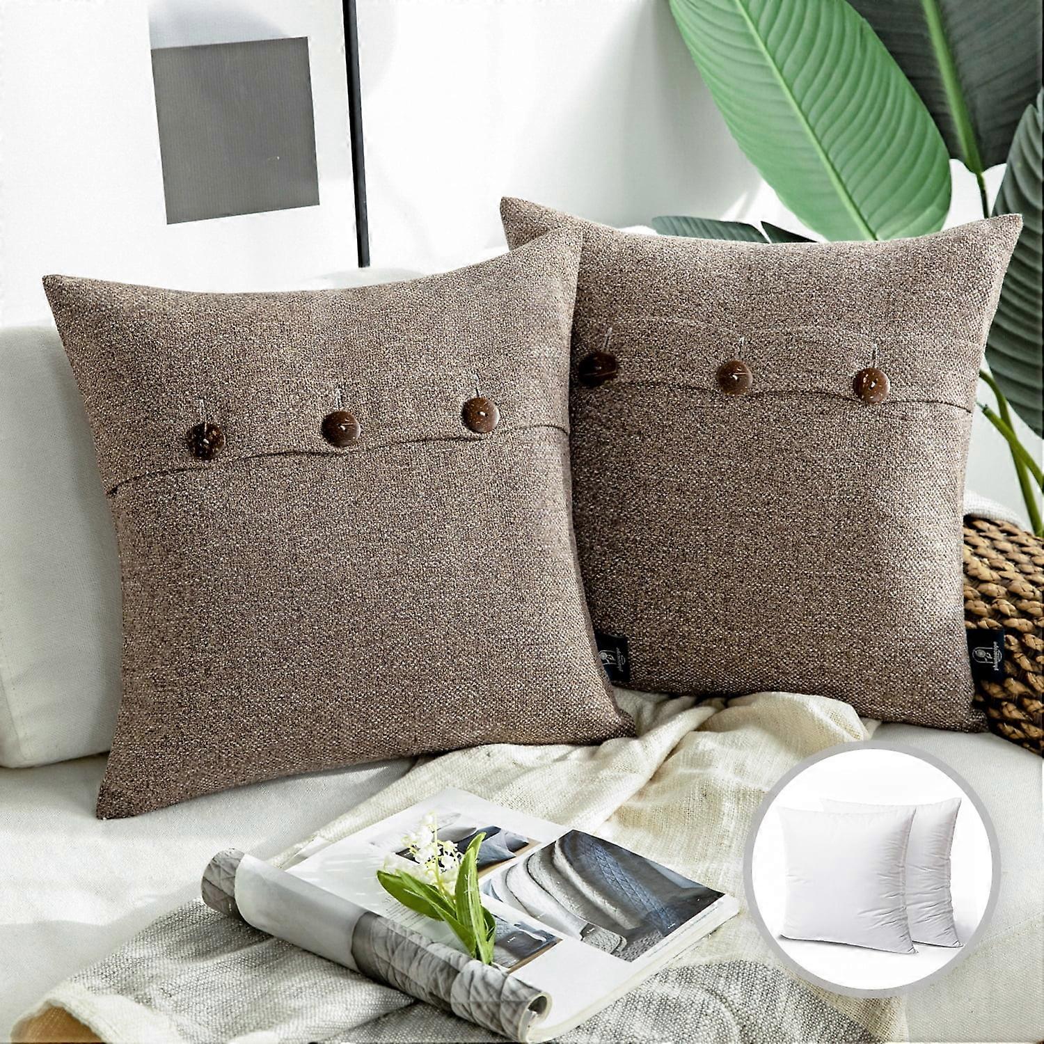 Decorate your space with Phantoscope Farmhouse Series Triple Button Decorative Throw Pillow, and enhance a sense of happiness by simple design! Made of 30% cotton and 70% polyester,the pillow cover is skin-friendly and comfortableThe cushion Down like comfort, our fluffy pillow provides extra cushion support for neck and lumbar whether you are reclining in bed or lounging on couch, soft yet firm and suits in offices, living room, bedroom, car, sofa and other locations. Size: 20 x 20 inch, 50cm x 50cm Material: 30% cotton, 70% polyester; 100% acrylic featured triple button Envelope closure secured with oversized button makes it easy to refill it 2 Pack of throw pillow cover with insert including Machine wash in cold water, delicate cycle