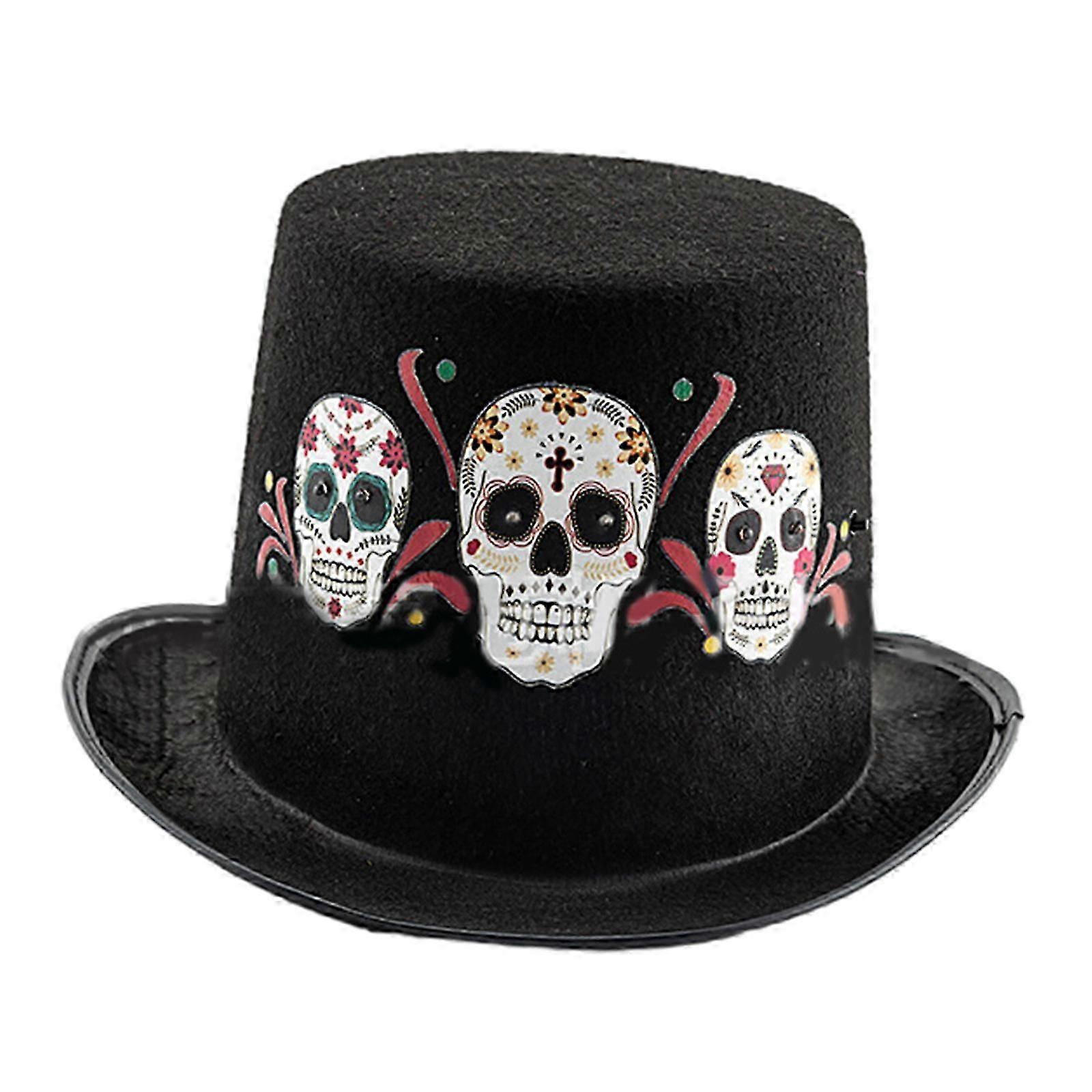 Fashion Black Flat Top Hat Skull Print Cap for Magician Costume Performances Theatrical Plays Musicals Hat Adult Teensz