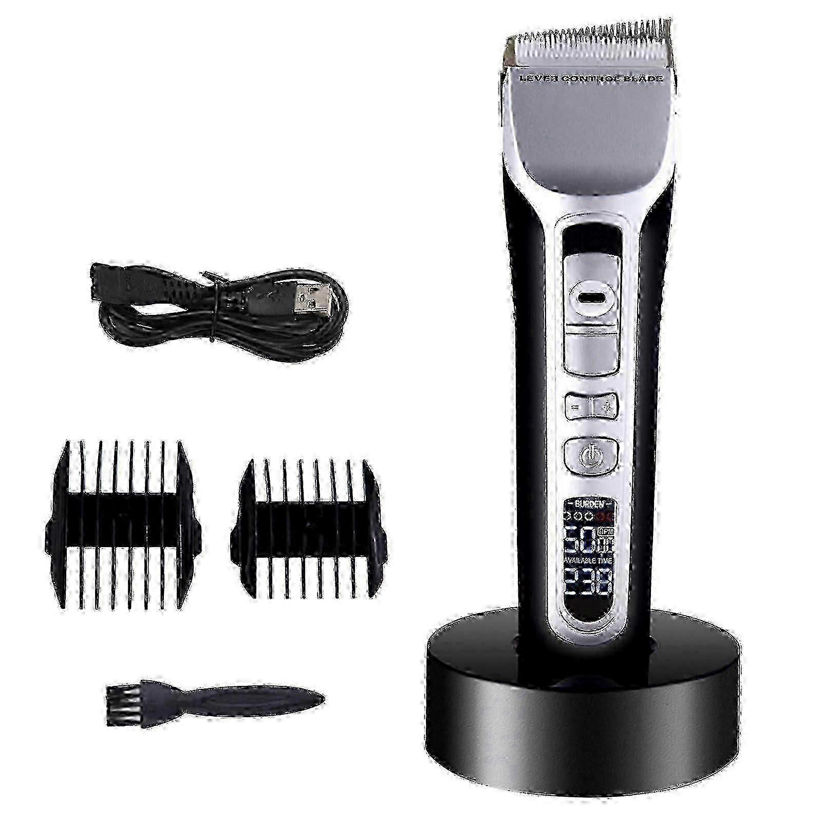 Electric Hair Clipper Household Men's Modeling Electrical Reasoning Hair Hair Salon Special Hair Clippers Electric Hair Clippers Inclined Head Features: A precises haircutOur Electric Hair Clipper is Self-Sharpening And Have A Precision Gaps For Close Trimming. Total VersatilityOur Electric Hair Clipper Is Designed For Precision Shaving And Includes 2 Trimmers Heads For Easy Collection And Organization. ConvenientFadingculture Hair Clipper Same Size As Your Hand. Protable Case. Easy Tostore. Long Battery Life With Led DisplayOur Electric Hair Clipper Equipped With A Powerful LithiumIon Battery. Suitable For All Hair TypesOur Electric Hair Clipper Use Magnetic Technology To Makes It Easier To Install And Detach The Trimmers Heads. It's Suitable For All Hair Types. Product 1 x Electric Hair Clipper The Main Parameters: Material: Abs Applicable People: Men Weight: 700g Color: Black Charging Time: 3 Hours Usage Time: 240 Minutes Charger: input AC100-240 50-60hz/output DC5.0V 1000mA Battery: 3.7V 2200mA battery type: lithiumion polymer How to use it: 1. Plug the charger into the Charger socket connection 2. Plug the charger into a power outlet 3. The barber will turn off the barber switchs into the charging stand, issued a littleTone 4. LCD screen, charging indicator light long light to indicate the charging state. Accessories: 2x shaving comb (3mm/6mm and 9MM/12mm)1x Charger 1x Brush 1x charging base x The barber can connect directly to the charger. x The charger can be operated by connecting the cable directly when the Barber has no electricity.