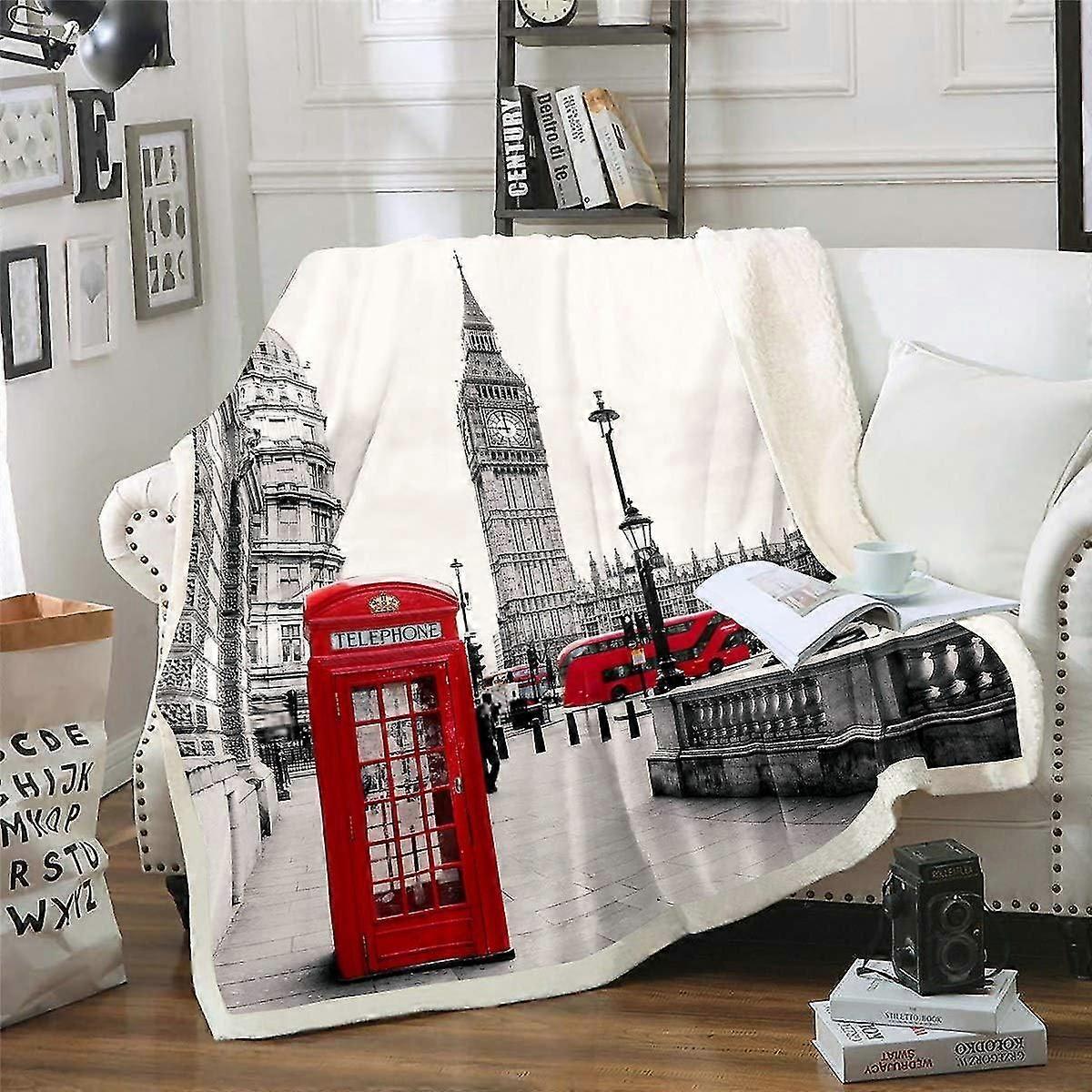 Big Ben Sherpa Blanket Red Phone Booth London Street Fleece Throw Blanket for Kids Boys Girls Adults British Cityscape Plush Blanket Western Buildingw