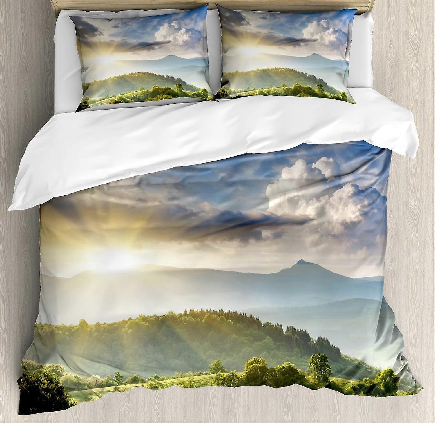Nature Duvet Cover Set, Rising Sun Clouds Over Forest Hill Woodland Idyllic View, 3PC Blue Green Bedding Set with 2 Pillowcases