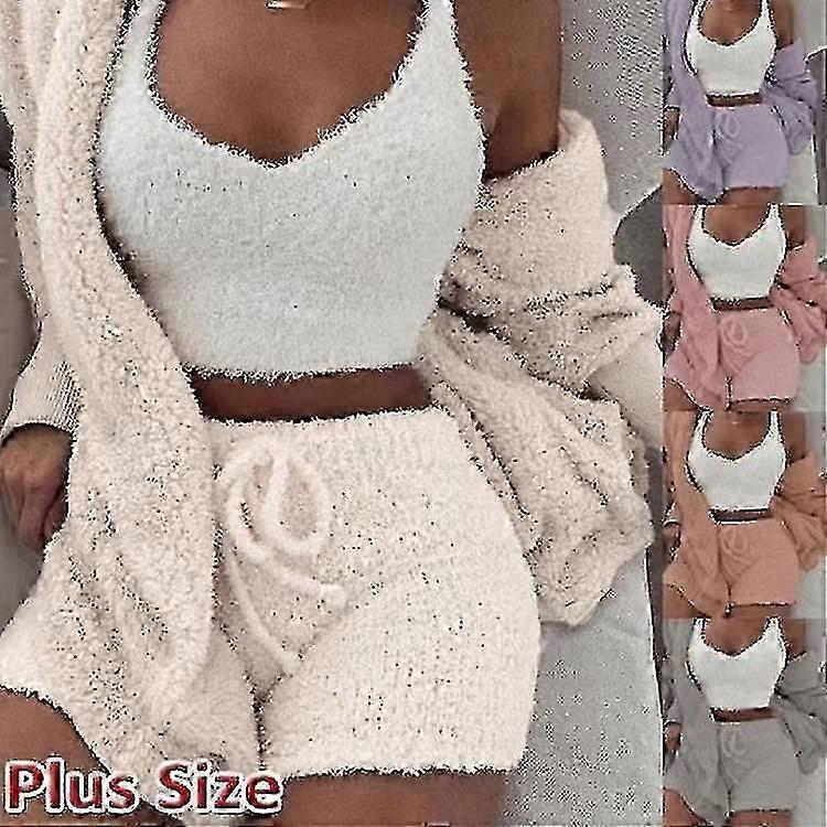 Womens Sexy Fuzzy 3 Piece Outfits Fleece Warm Cardigan Crop Top Shorts Set Pajamas Loungewear .