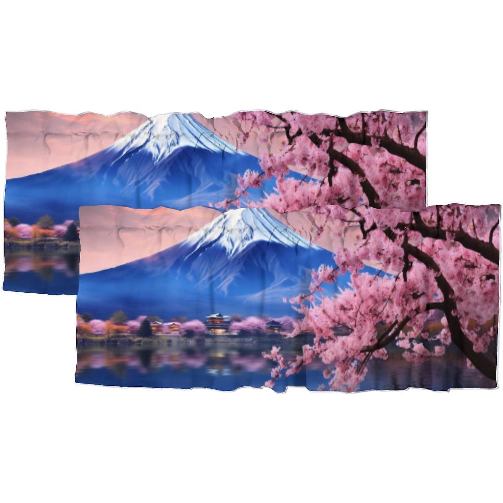 Japanese Art Kitchen Valances, Cherry Blossom Spring Flower Abstract Mountain, 54x18inch (2Pcs), Rod Pocket Window Curtain for Kitchen Bathroom