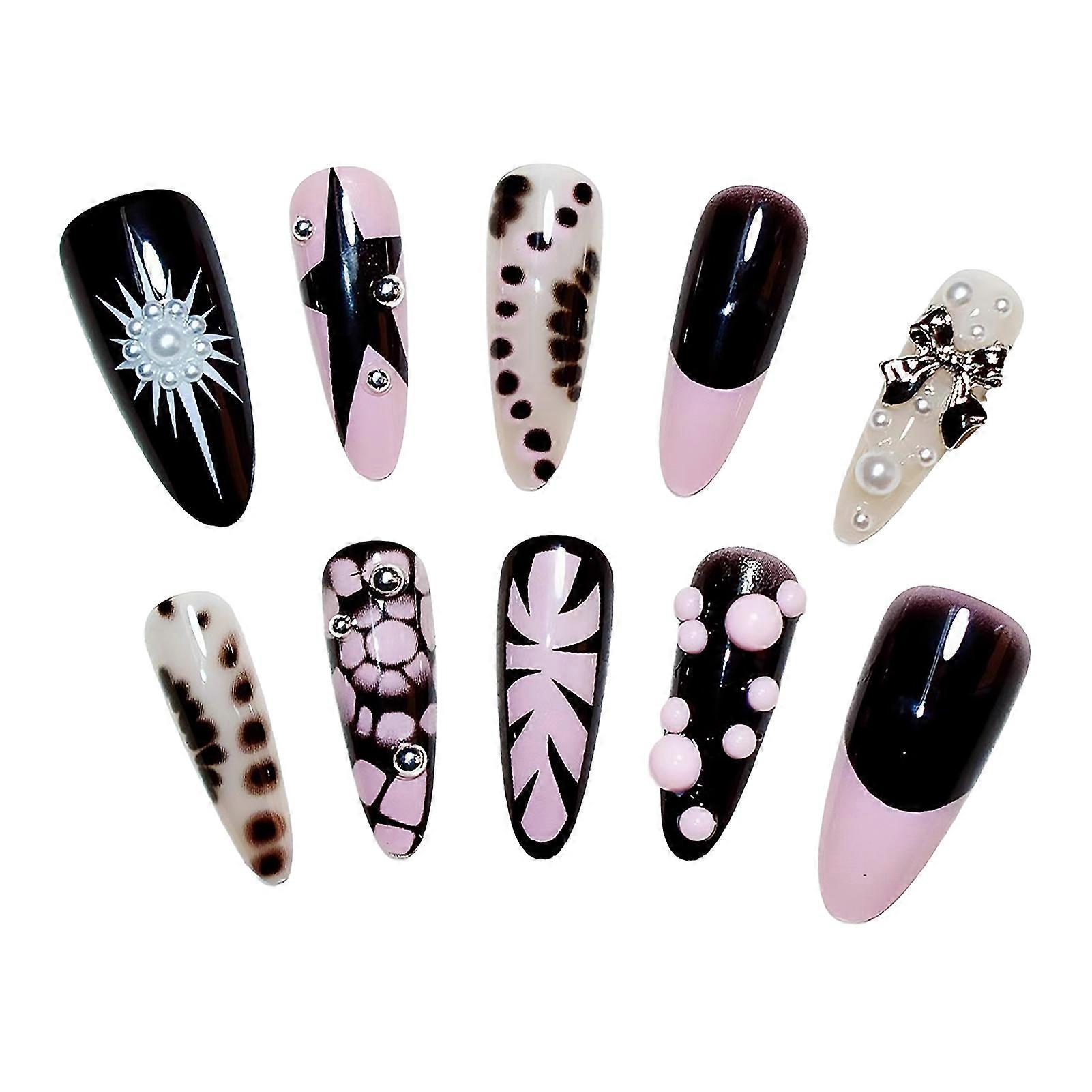 10PCS Almond Shape Fake Nails With Star Printed Pink Black Sweet Cool Style
