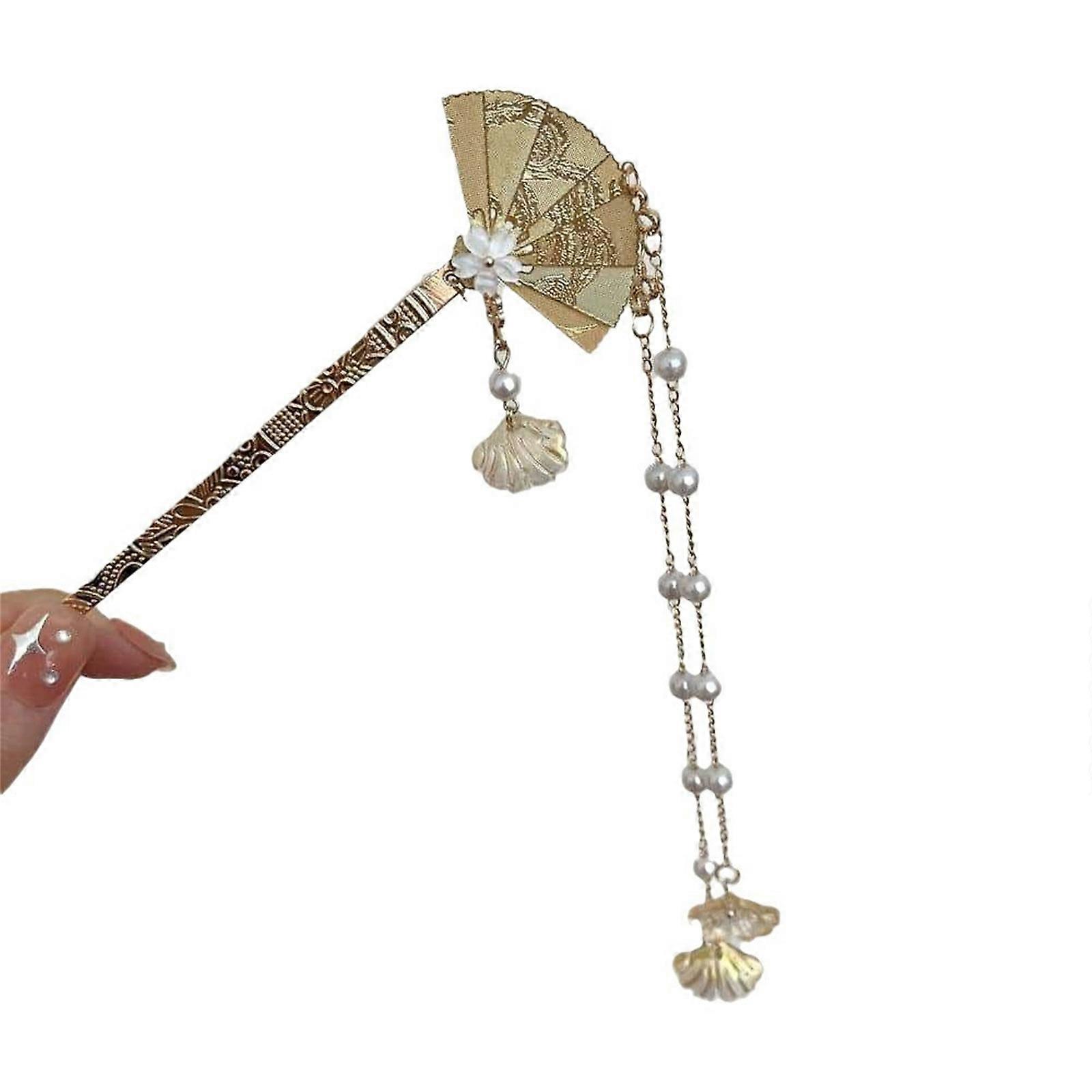 Vintage Chinese Style Hairpin Alloy Folding Fan Design Hairpin with Tassel Decor