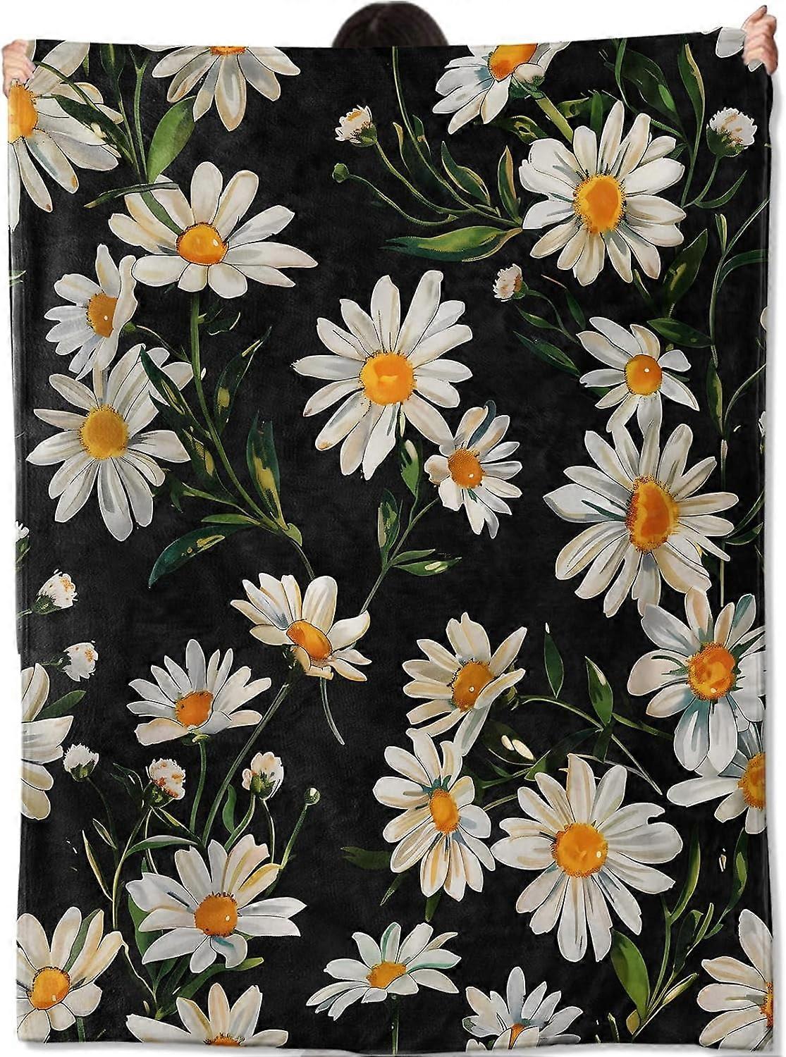 White Daisy Blanket, Soft Floral Throw 60x80in, Lightweight Cozy Couch Blanket for Home Sofa Bed, Green Leaf Design