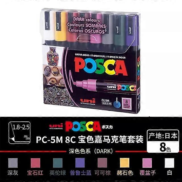 Uni Posca Markers Marcadores PC-1/3/5M Acrylic Permanent Graffiti Paint Pen Art Supplies For Rock Metal Leather Ceramic Glass PC-5M 8Colors(Dark)
