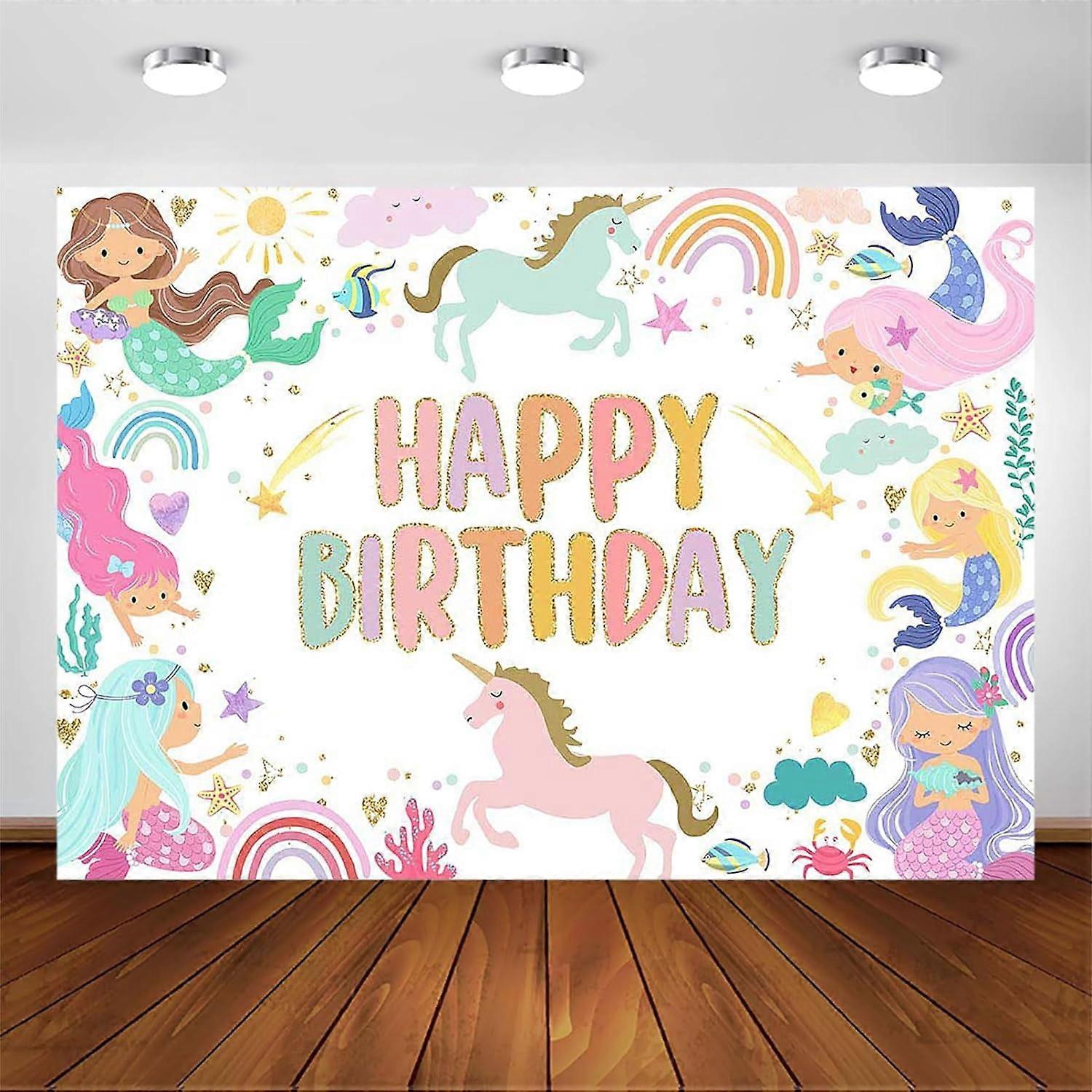 Mermaid & Unicorn Birthday Backdrop, Rainbow Theme Party Decorations Compatible with Mermaid Birthday, Happy Birthday Banner for Girls