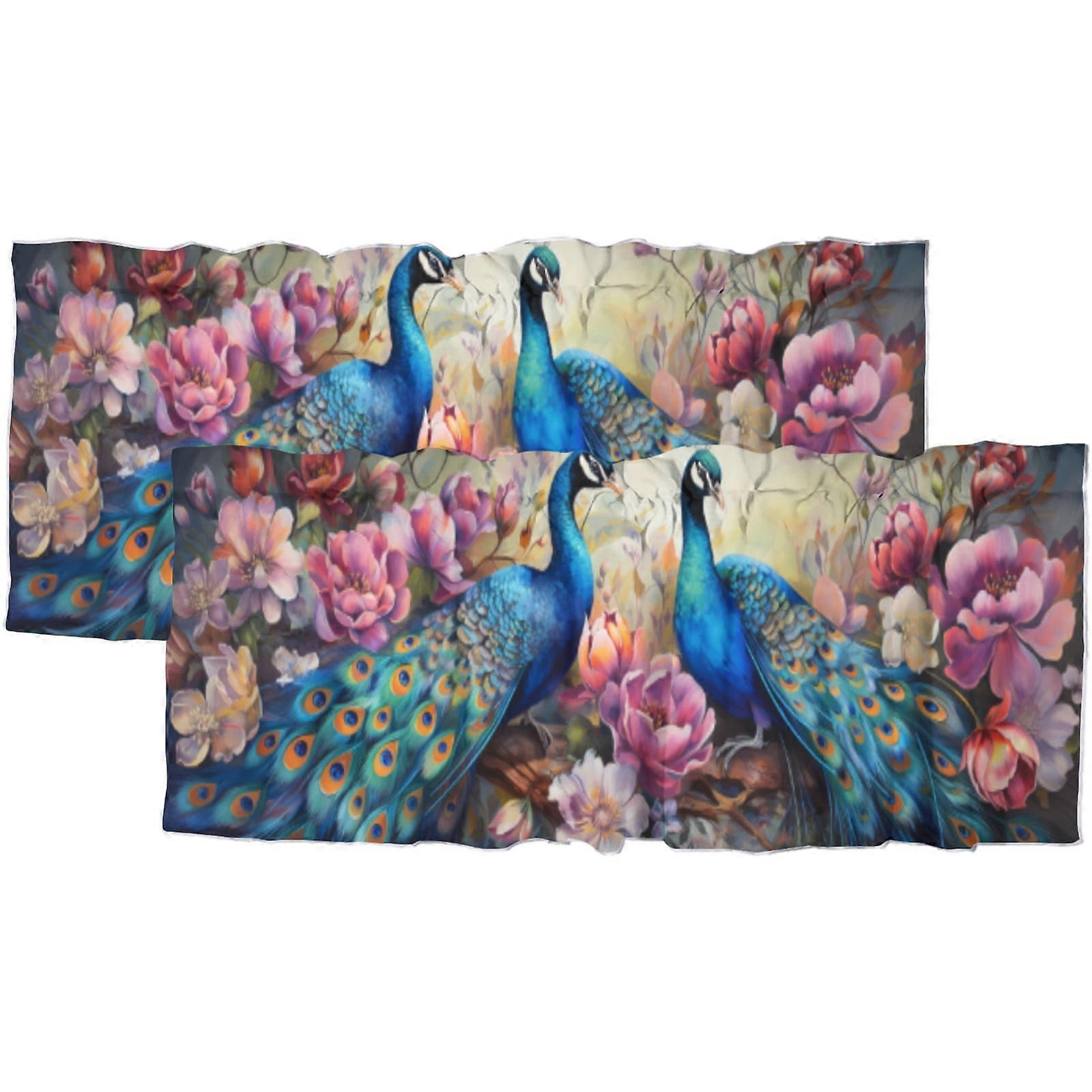 Peacock Valance Curtain for Kitchen, Blue Bird Asian Animal Feather Design, 54x18 in, 2 Panel, Rod Pocket Window Curtain