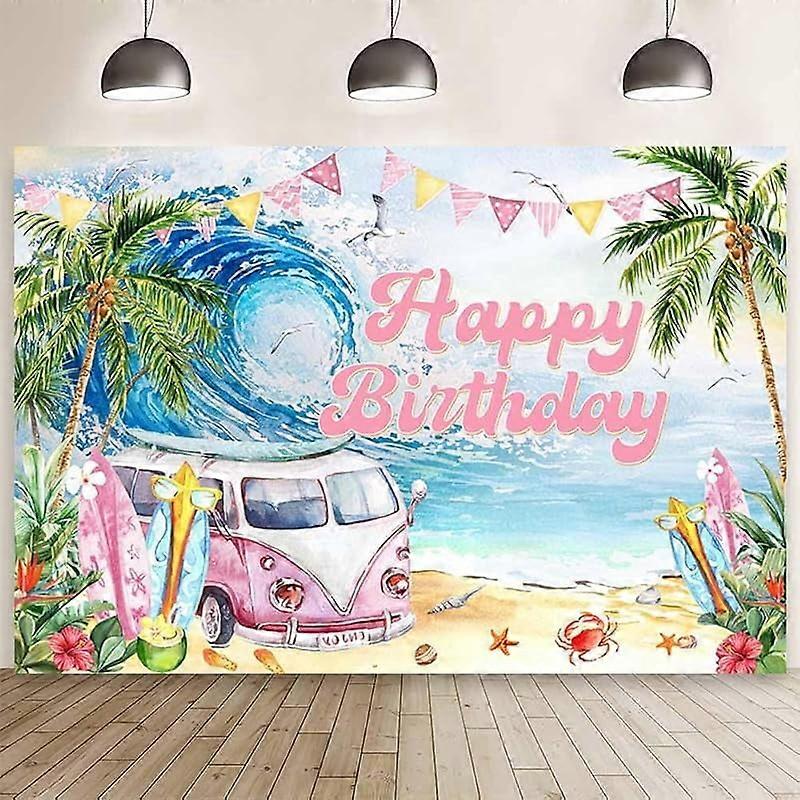 7x5ft Blue Summer Beach Birthday Backdrop, compatible with Hawaiian Tropical Photography, Ocean Coconut Tree Bus, Party Decor for Girls, Cake Table,