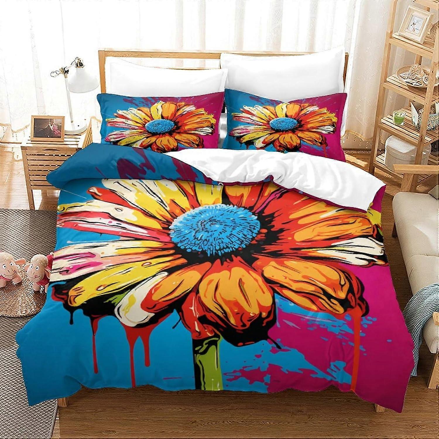 Colorful Flowers Pop Art 3D Printed Duvet Cover Set (3Pc) with Pillowcases, Zipper Closure, Microfiber - Compatible with Kids & Adult Beds