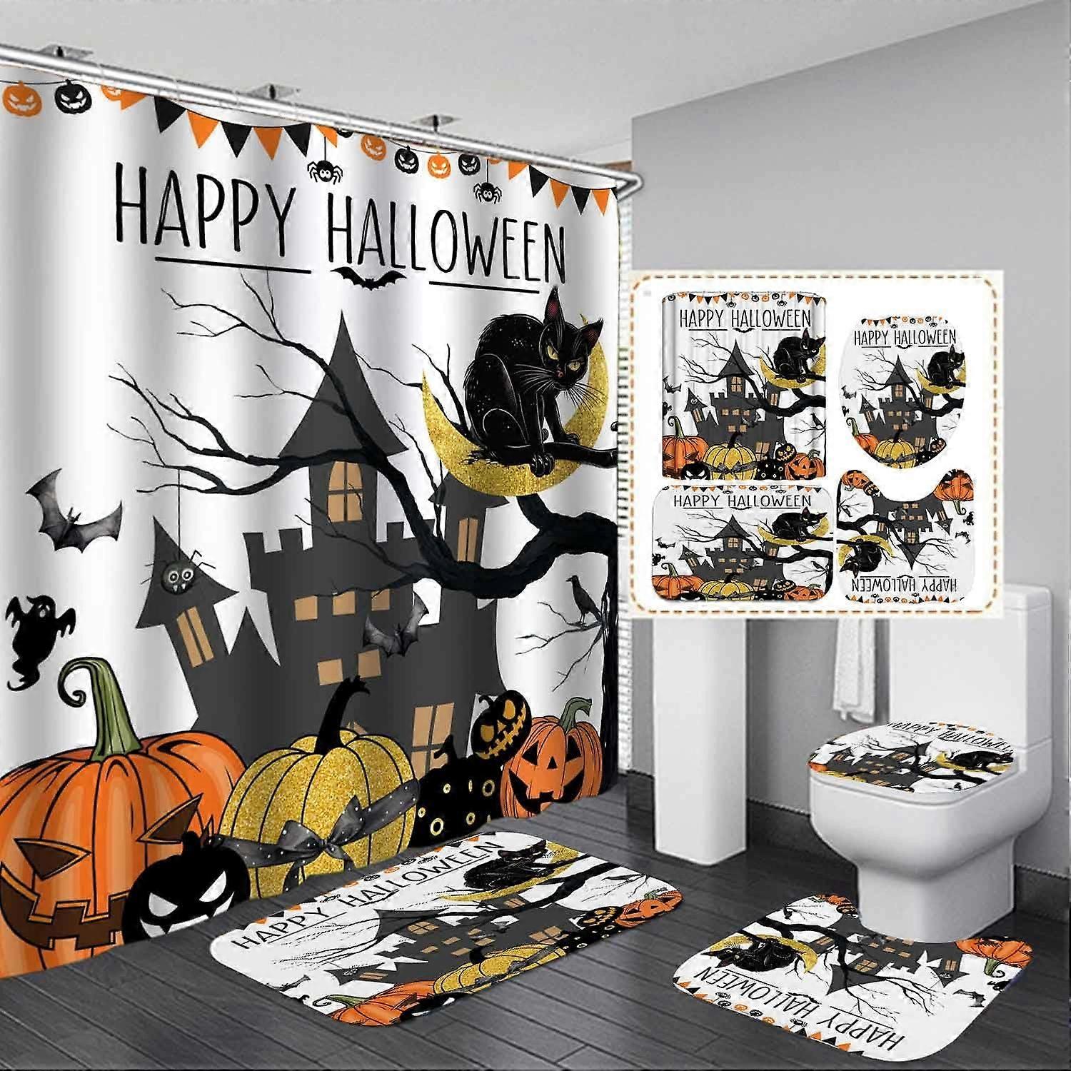 4PCS Cute Ghost Halloween Shower Curtain Set, Waterproof Fabric, Non-Slip Bath Mat, Compatible with Standard Showers, Funny Cartoon Spooky Orange