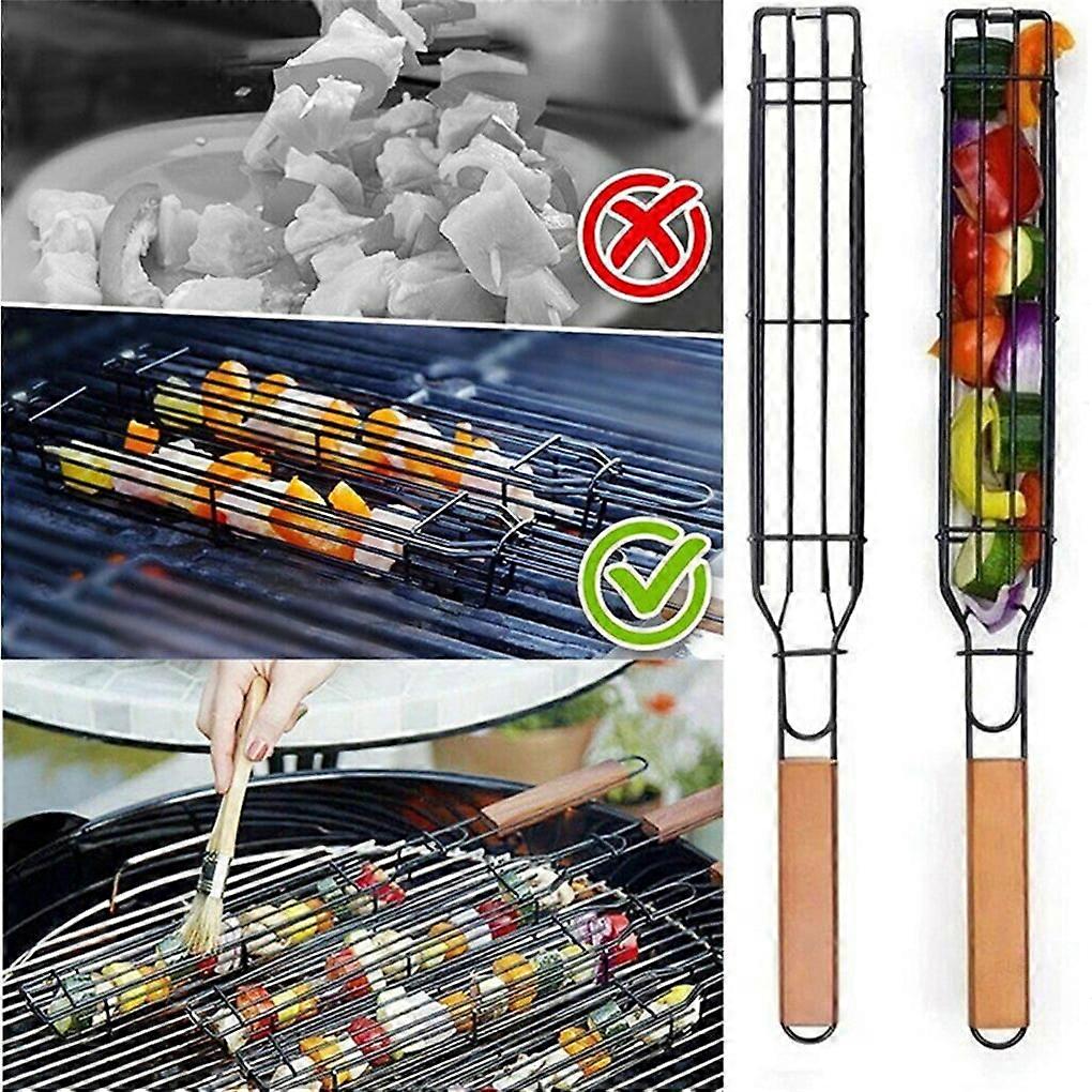 Tssuoun Stainless Reusable Grilling Basket Wooden Handle Vegetables BBQ Grill Baskets Barbecue Vegetables Meat Holder Mesh Tool