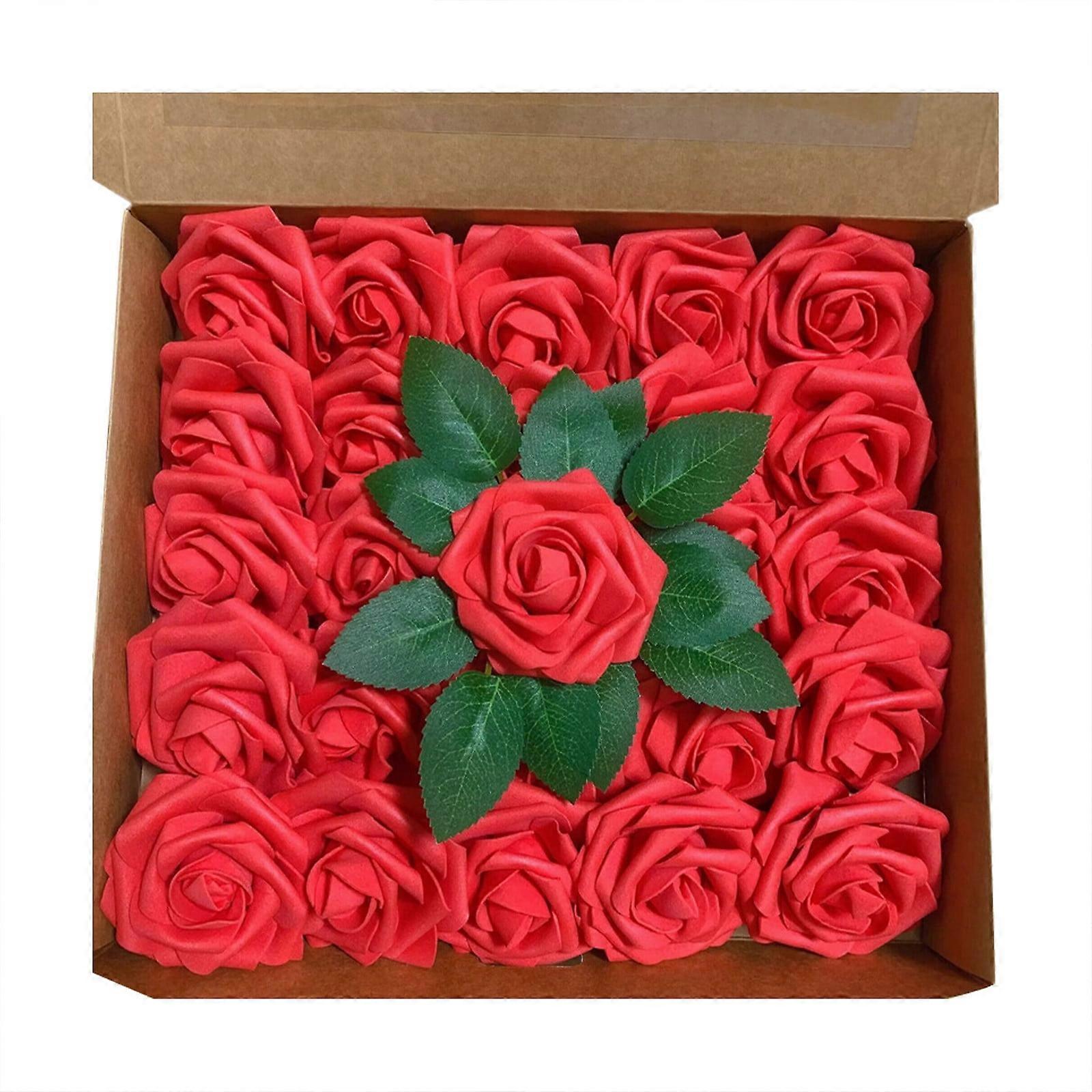 Tkrady Floroom 25pcs Real-Looking Ivory Foam Roses with Stems for DIY Wedding Bouquets, Bridal Shower, Party Decor (Red)