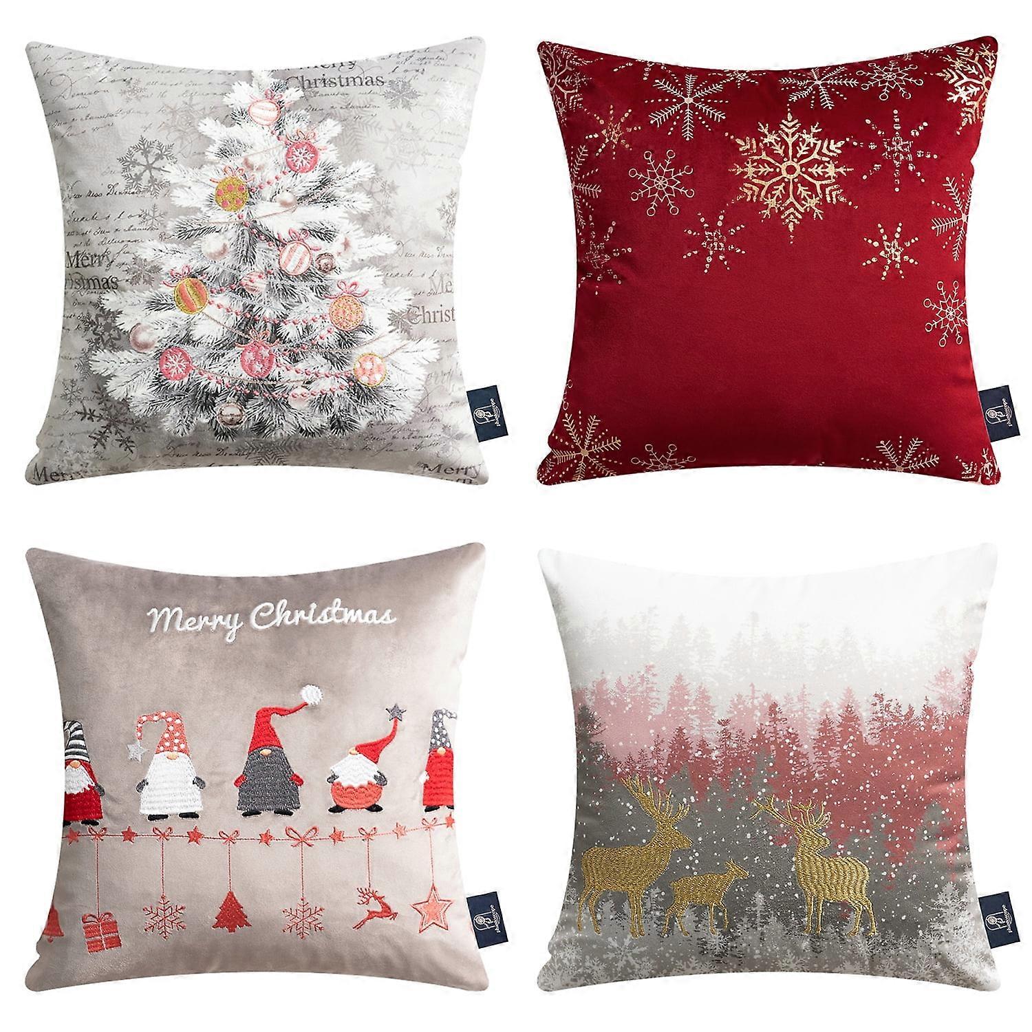 Phantoscope Merry Christmas Velvet Embroidered Decorative Throw Pillow, Red and Gray, 18" x 18",Set of 4