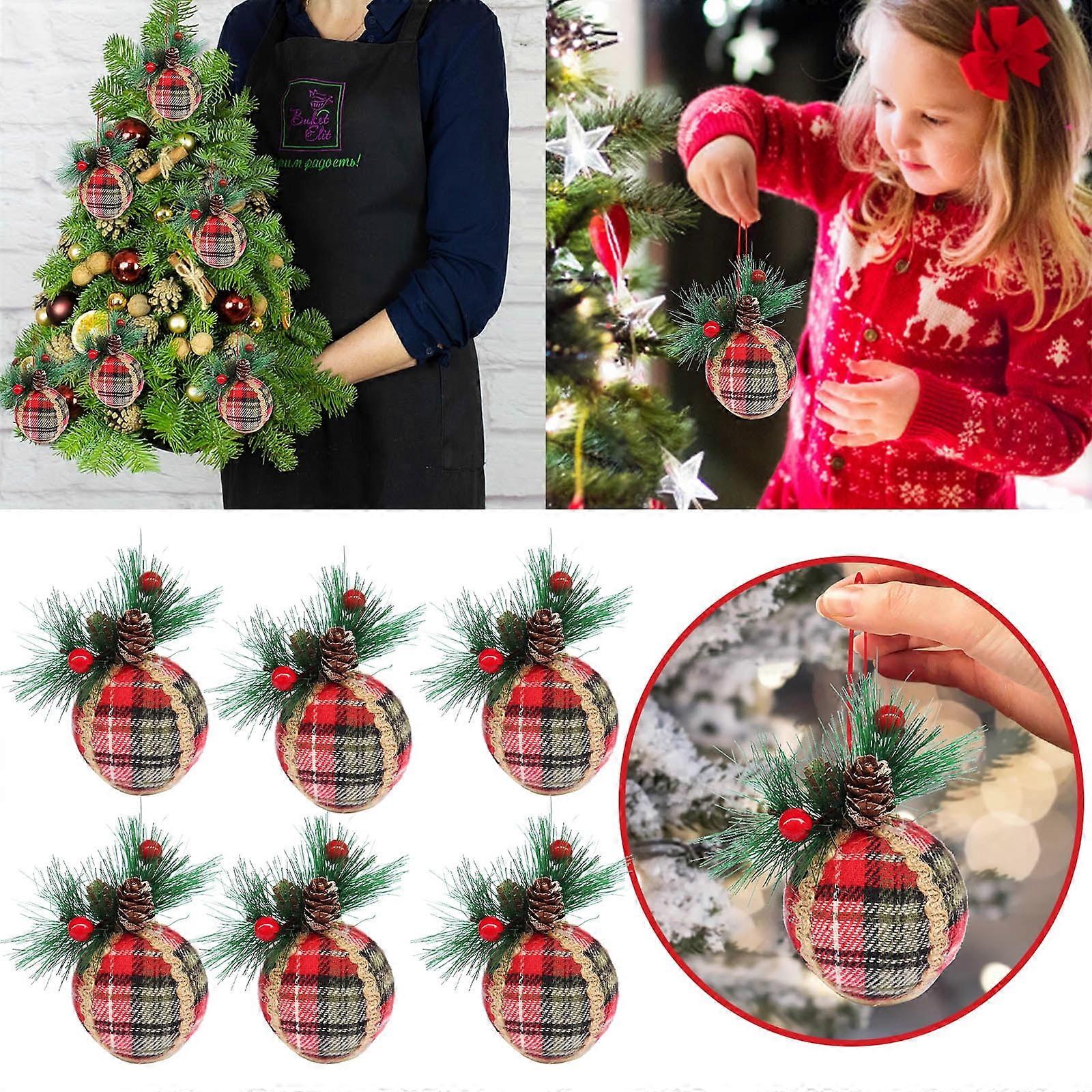 6PCS Christmas Plaid Ball Ornaments, Shatterproof with Pinecones & Greenery, Black Red Burlap Foam Hanging Decorations for Xmas Tree