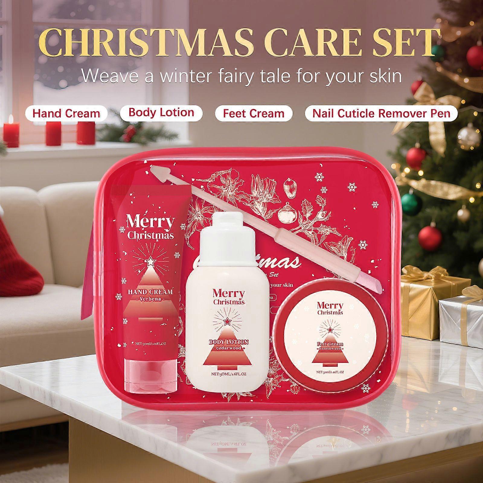 Christmas Body Care Gift Set - 4-Piece Moisturizing Kit with Hand Cream, Body Lotion, Foot Cream & Nail Cuticle Pen, Festive Fragrance for Dry Skin Re