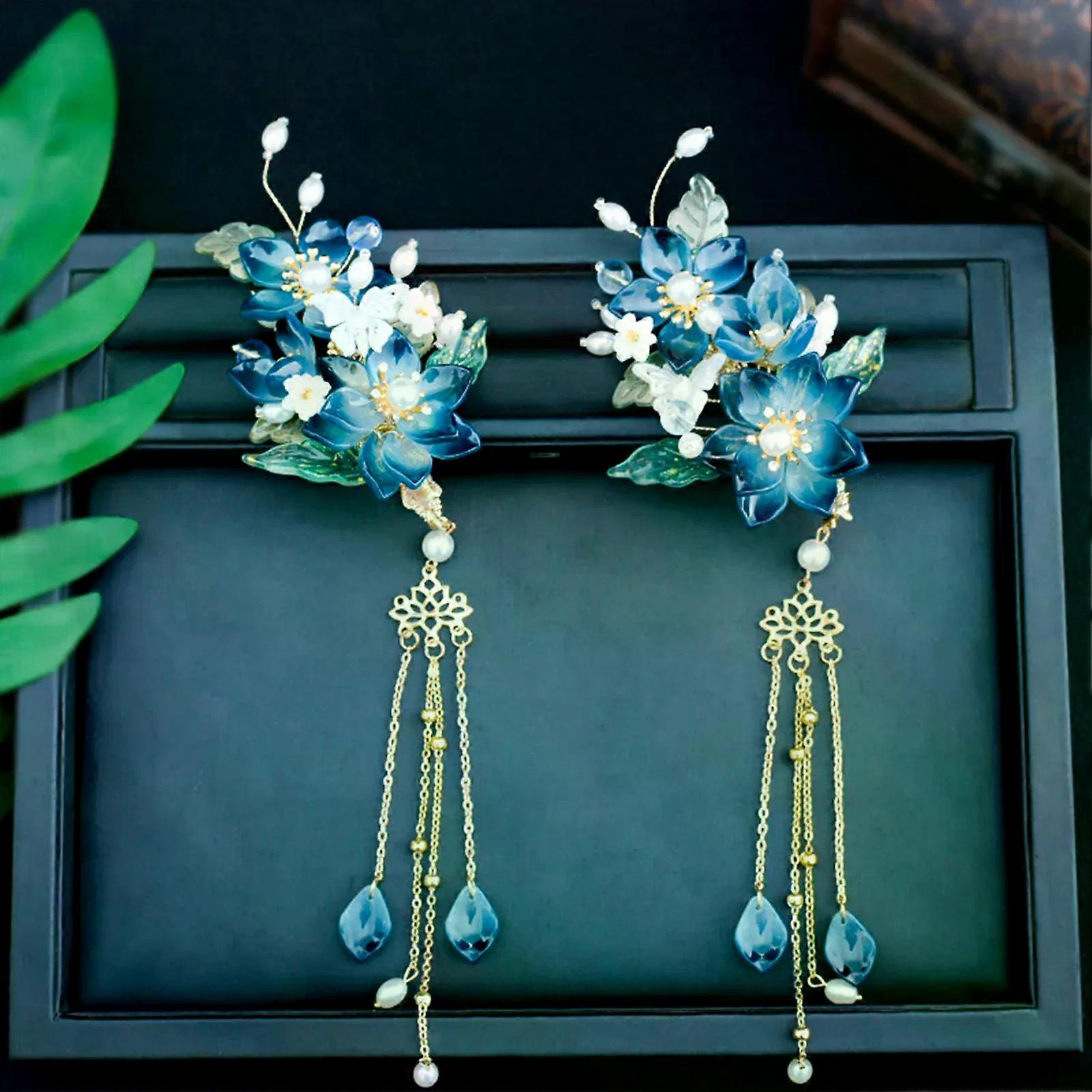 1pair Tassel Chinese Hair Clips Wedding Bride Headpiece Jewelry Dark Blue Floral Hairpin Barrettes Vintage Girl Hanfu Tiara Gift