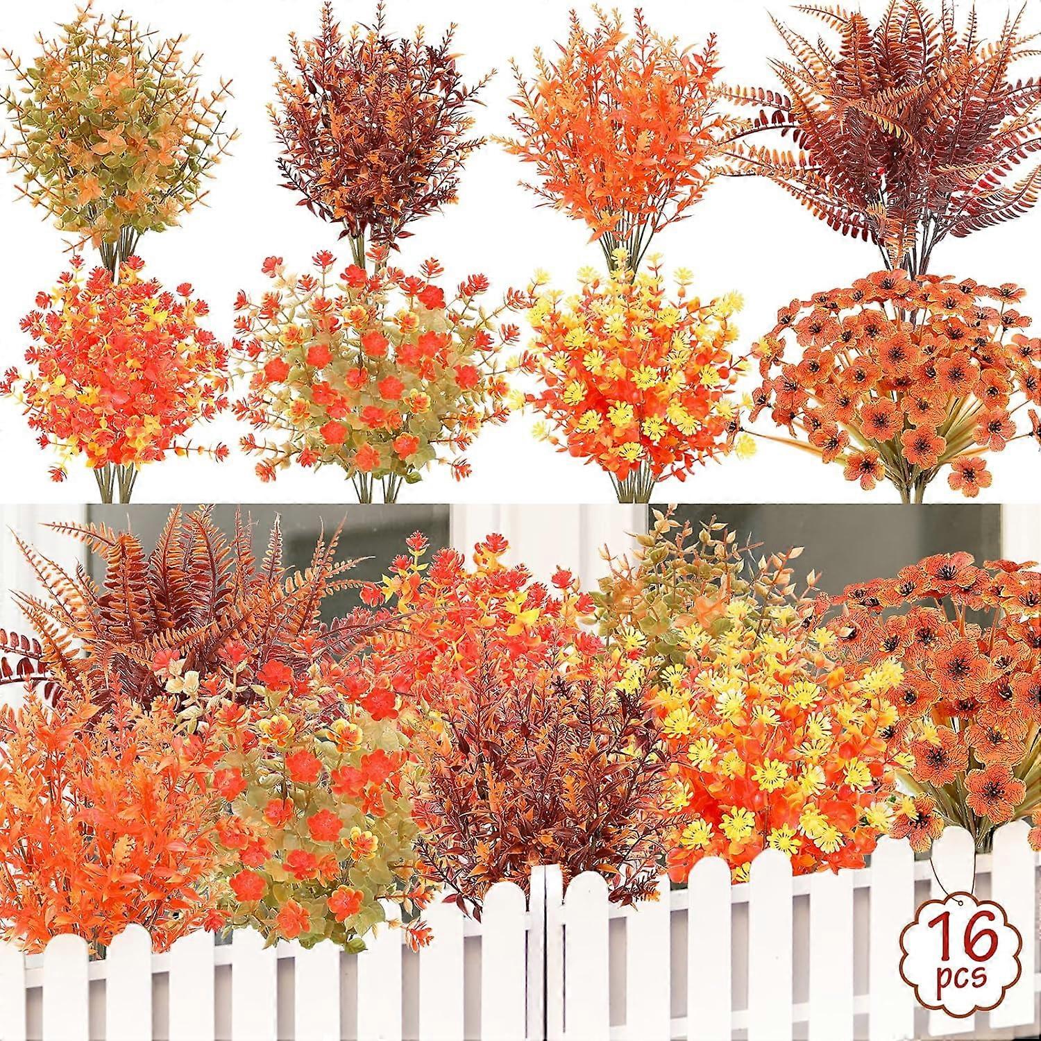 Artificial Fall Flowers, 16pcs UV Resistant Fall Fake Flowers, Faux Plastic Fall Flowers for Decoration Home Kitchen Garden Wedding Party Decor