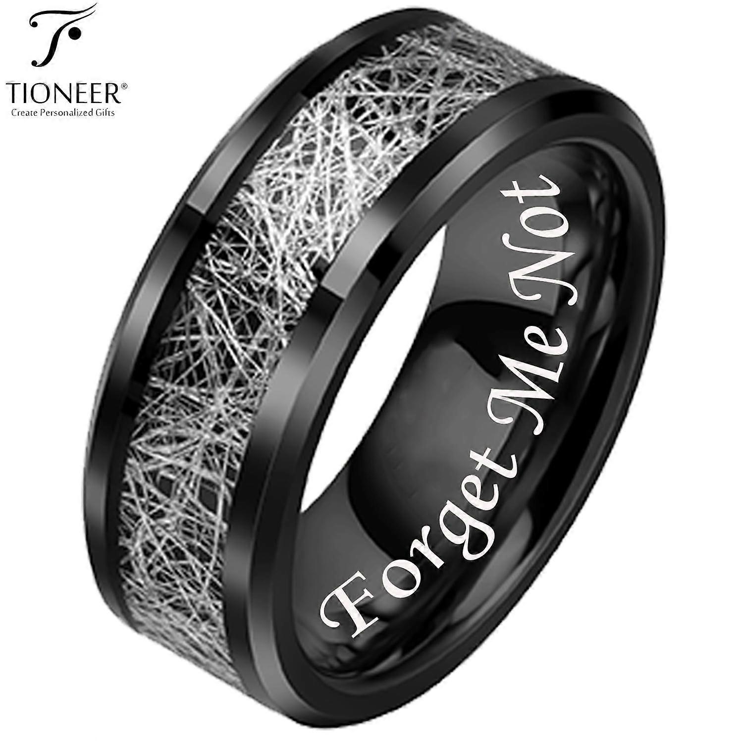The Tioneer Tungsten Ring combines durability with sleek style. Crafted with a black carbon fiber inlay, it exudes a modern and sophisticated look suitable for both men and women. This 8mm ring features a subtle diamond accent, adding a touch of elegance. As an extra personal touch, it offers free engraving, allowing you to customize it with a special message or initials. Whether as a symbol of commitment or a fashion statement, this ring is sure to impress. Tungsten Carbide Carbon Fiber Inlay Ring Width: 8 MM Black IP, Comfort Fit WITH FREE ENGRAVING OPTIONS: Promise Me / I Love You / Yours Forever / Be Mine / My Soul Mate / Always & Forever / Forget Me Not (in white lettering)
