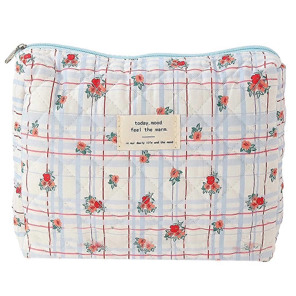Women Quilted Makeup Bag Floral Organizer Cotton Female Travel Bag (Blue Plaid)