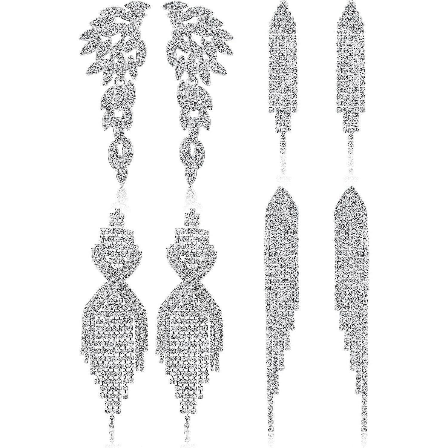 Jstyle 4 Pairs Silver Clip on Earrings for Women, Sparkly Rhinestone Tassel Chandelier Teardrop Dangle Earrings Compatible with Non-Pierced