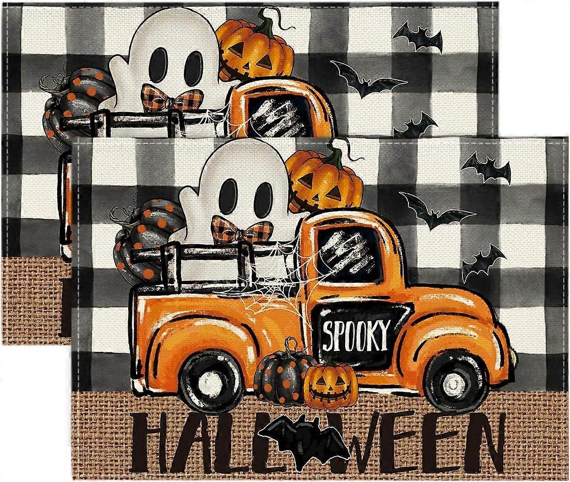 Halloween Placemats Set of 2 - 12x18 Inches Buffalo Plaid Bat Ghost Truck Design | Seasonal Dining Table Decor for Parties, Kitchen & Dining | Spooky