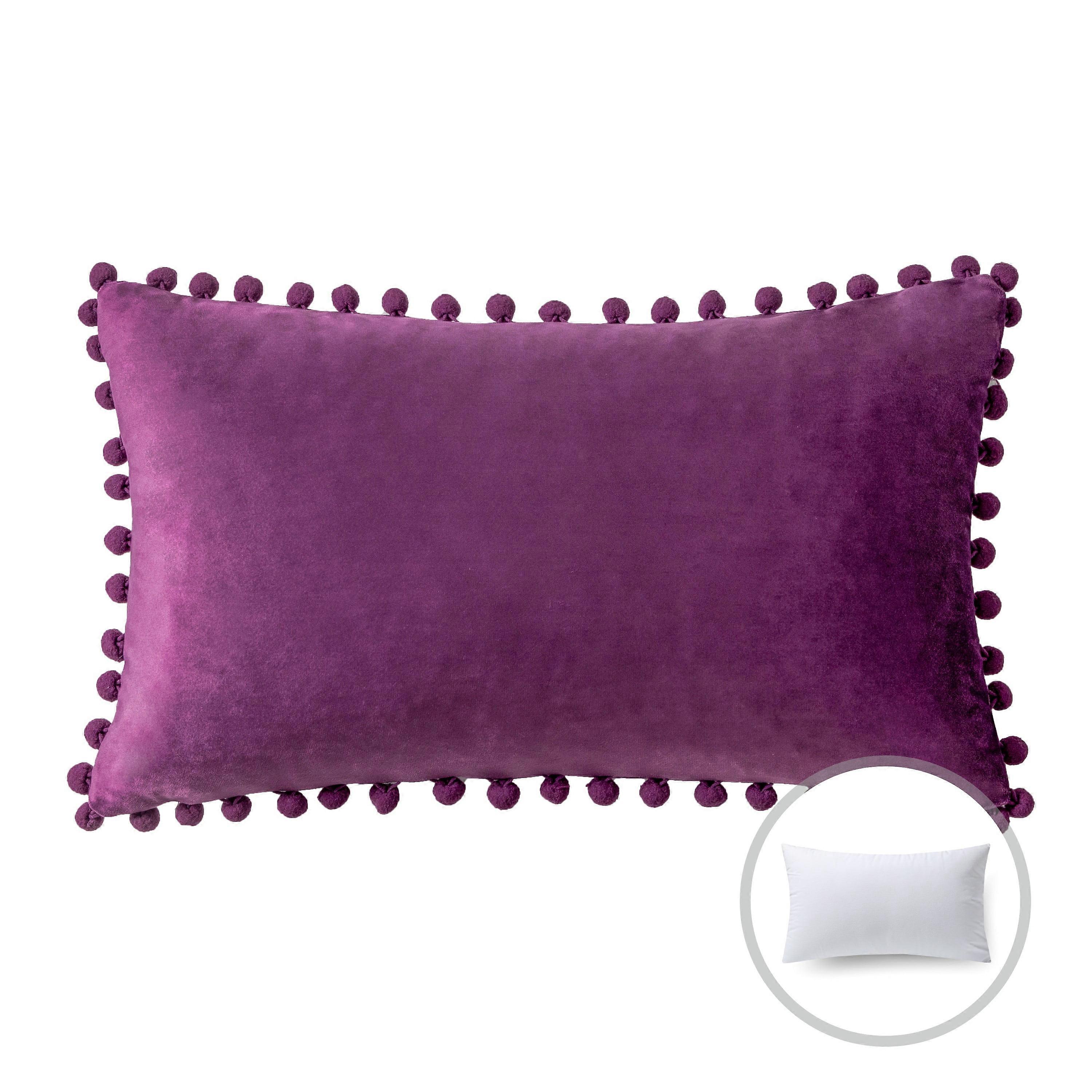 Phantoscope Velvet Series Pom Pom Rectangle Decorative Throw Pillow, 12" x 20", Dark Purple, 1 Pack