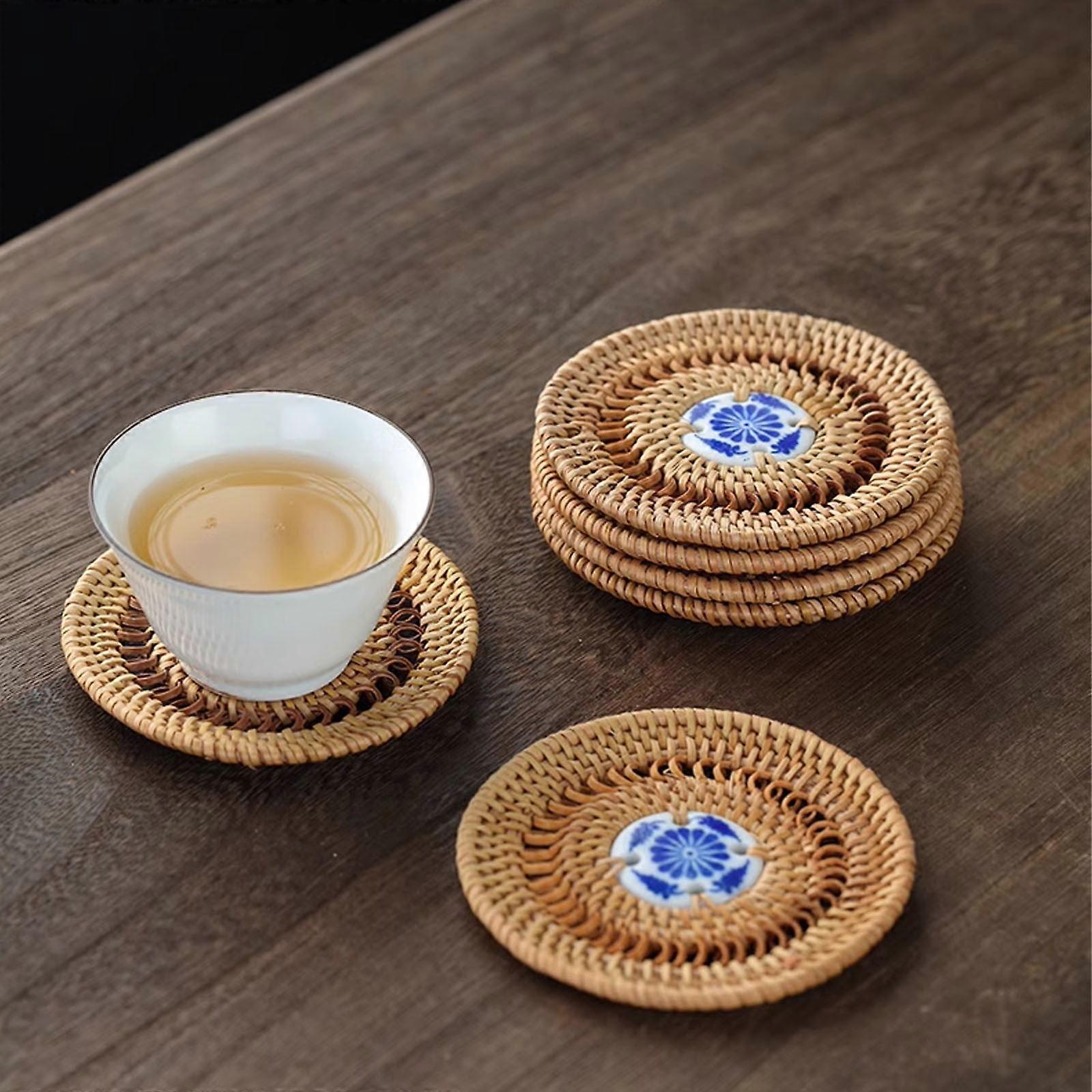 Fnyoxu Blue and White Porcelain Piece Rattan Tea Coaster,Round Placemats,Coffee Mats,Kitchen Table Mats,Easy To Clean Round Kitchen Table Mats