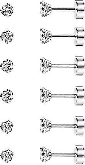 Cterwk 6 Pairs 14K Silver Plated Stainless Steel Stud Earrings with Cubic Zirconia, 3MM, Silver - Compatible with S925 Ear Posts
