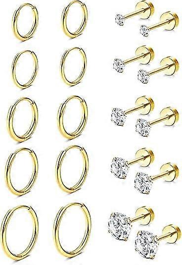Cterwk 10 Pairs Flat Back Earrings Hoop Stud Earrings 14K Gold Plated Mini Small Hoop Earrings for Women Men, Gold