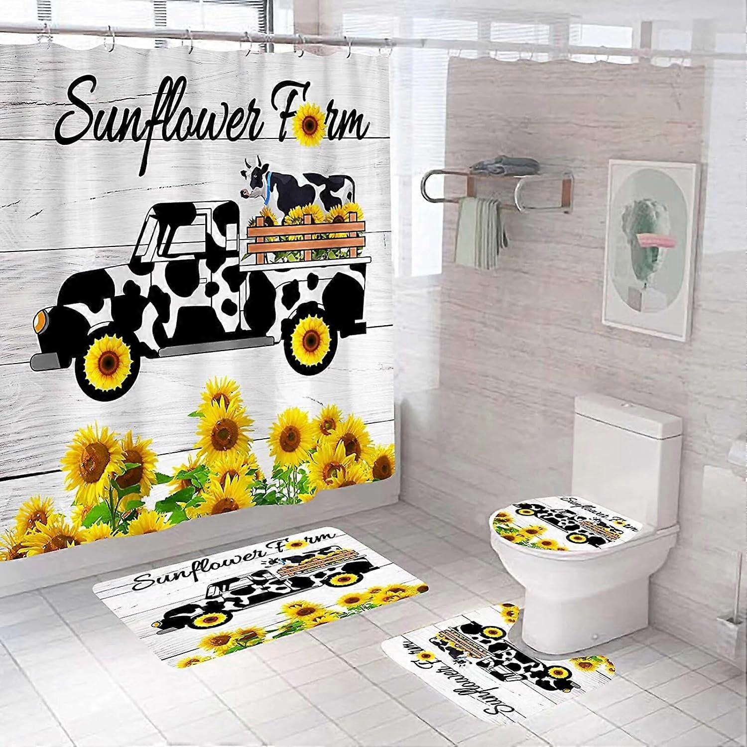 4Pcs Farmhouse Cow Truck Sunflower Shower Curtain Set with Non-Slip Rugs, U-Shaped Mat, Toilet Cover & 12 Hooks, 70.8×70.8