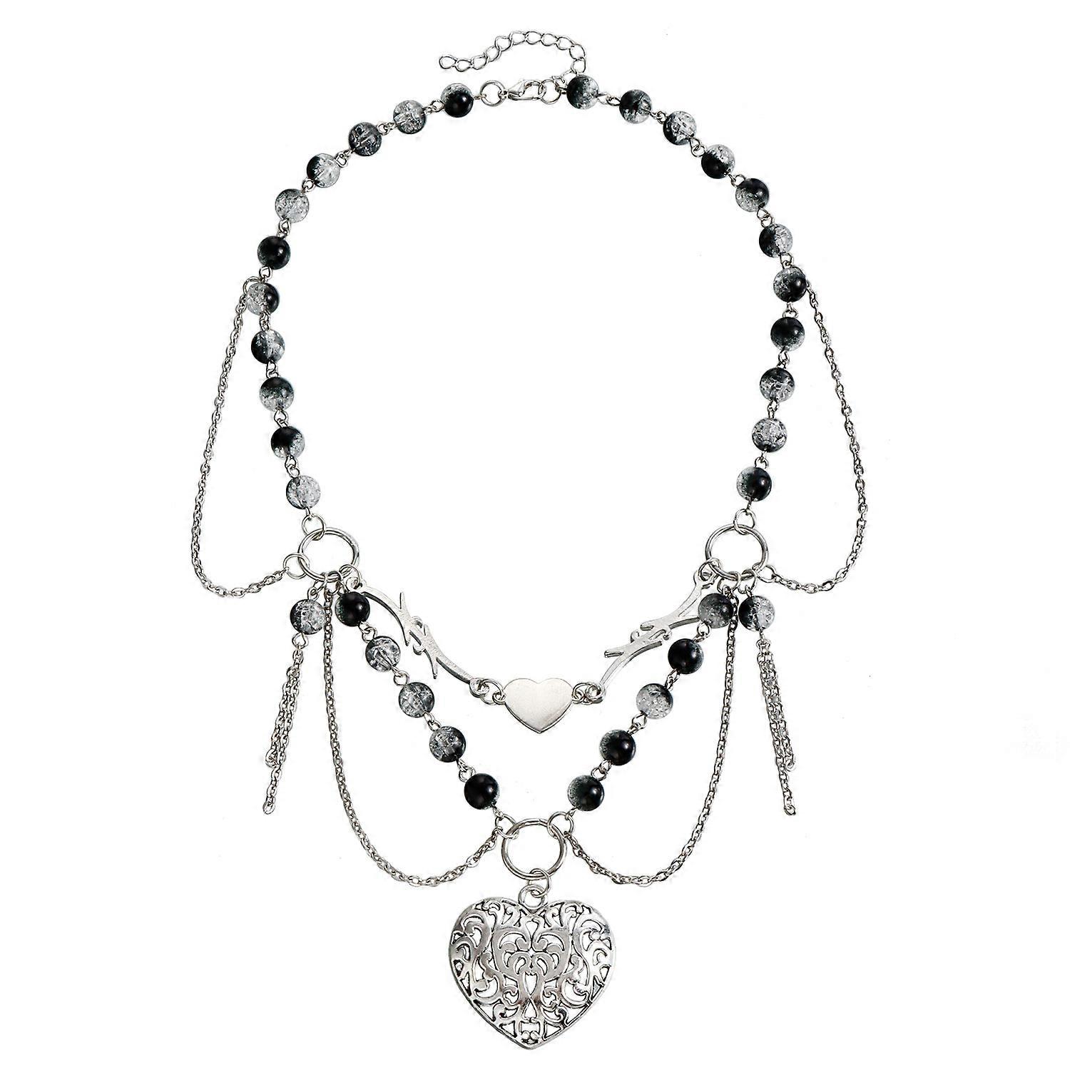 Necklace, Double Layer Beaded Tassel Exaggerated Heart Pendant for Women Versatile