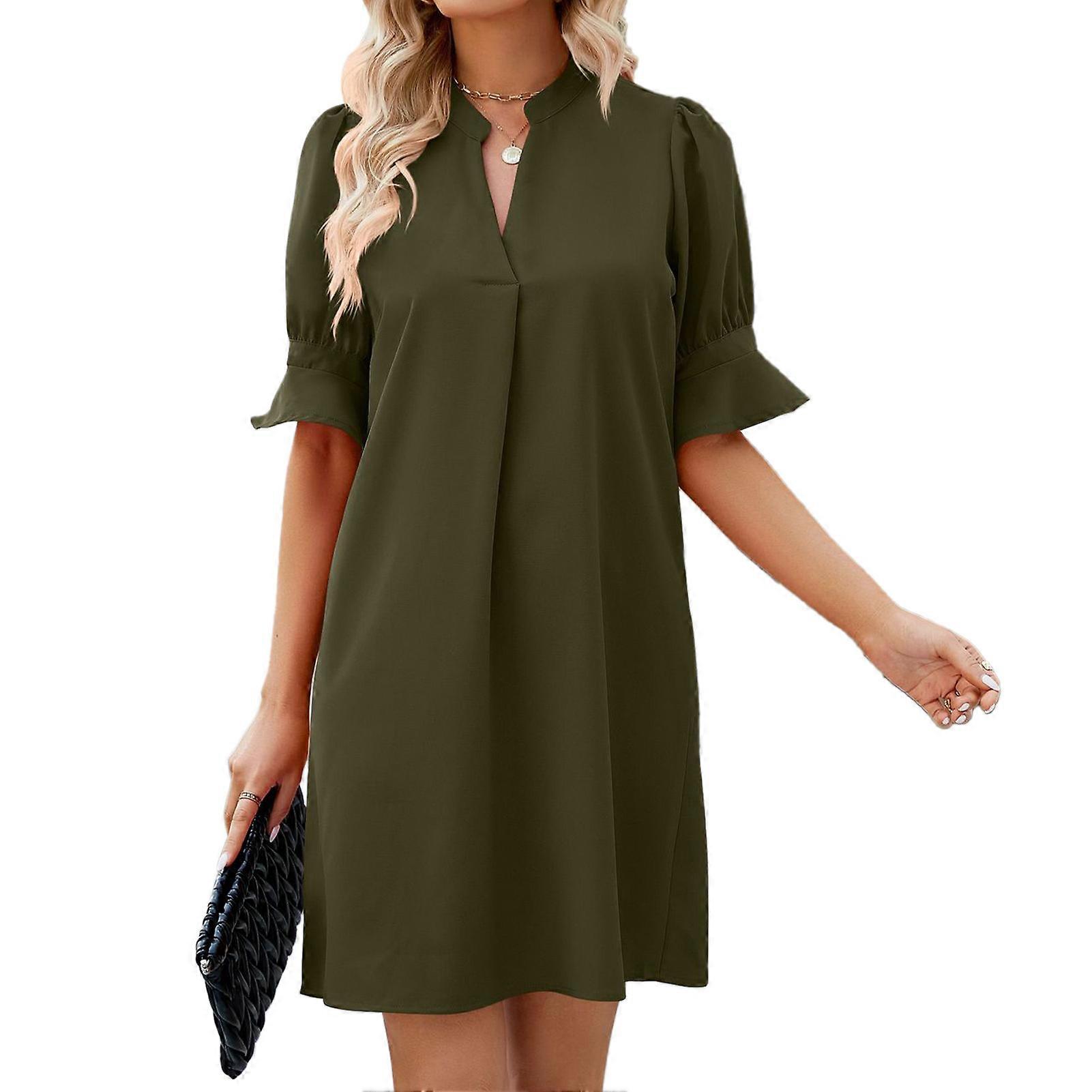 Women V Neck Short Dress Pure Color Half Puff Sleeves Loose Fitting Summer Dress for Daily Wear