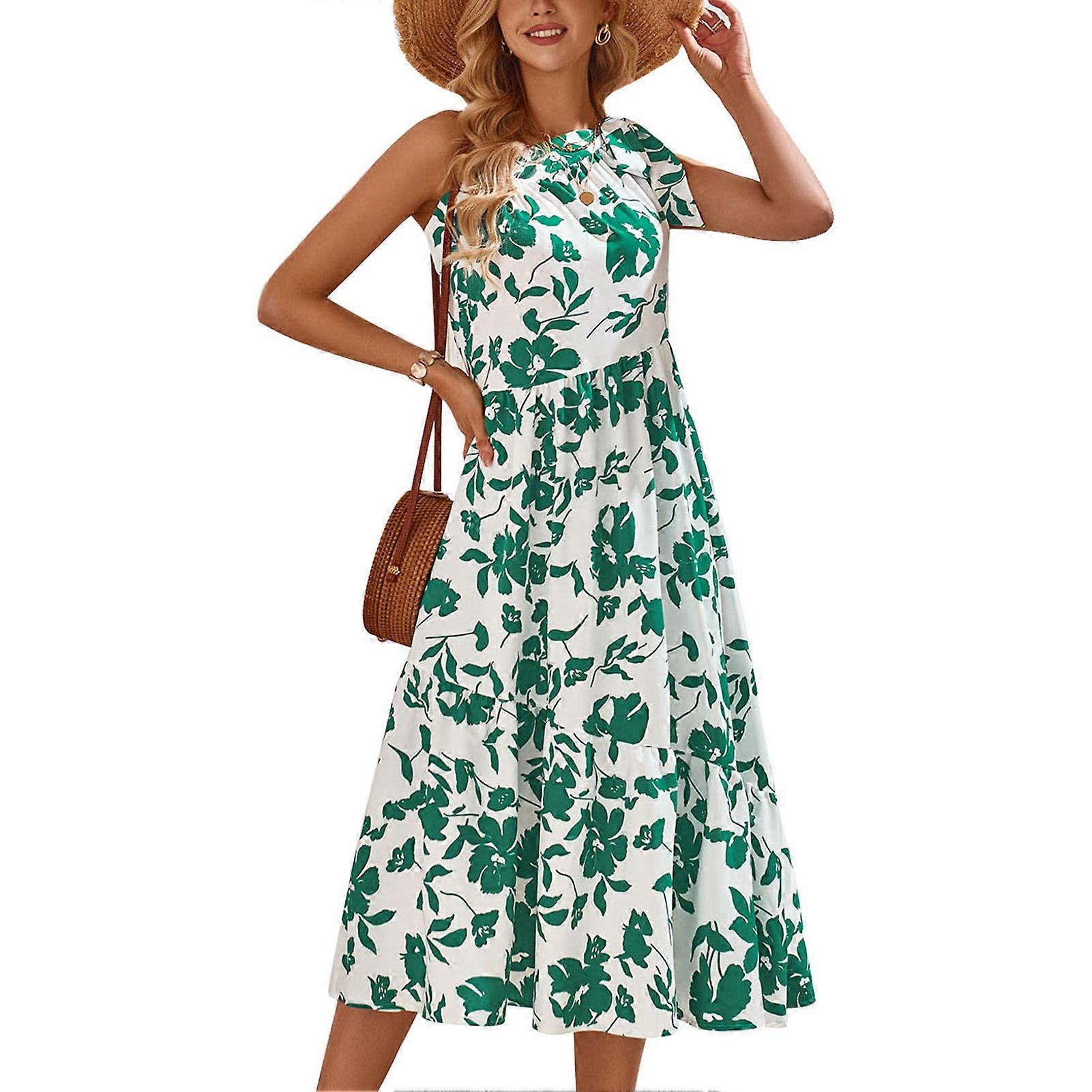 Floral Printed Midi Elegant A Line Ruffle Hem Gathered Waist Knot One Shoulder Sleeveless Dress for Women