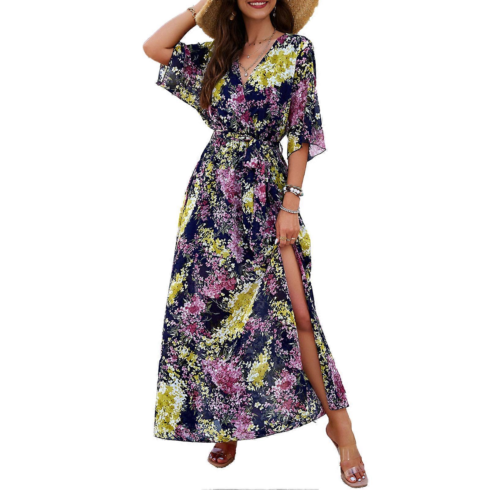Floral V Neck Split Hem Half Sleeve Breathable Casual Women Dress with Waist Tie for Spring Summer