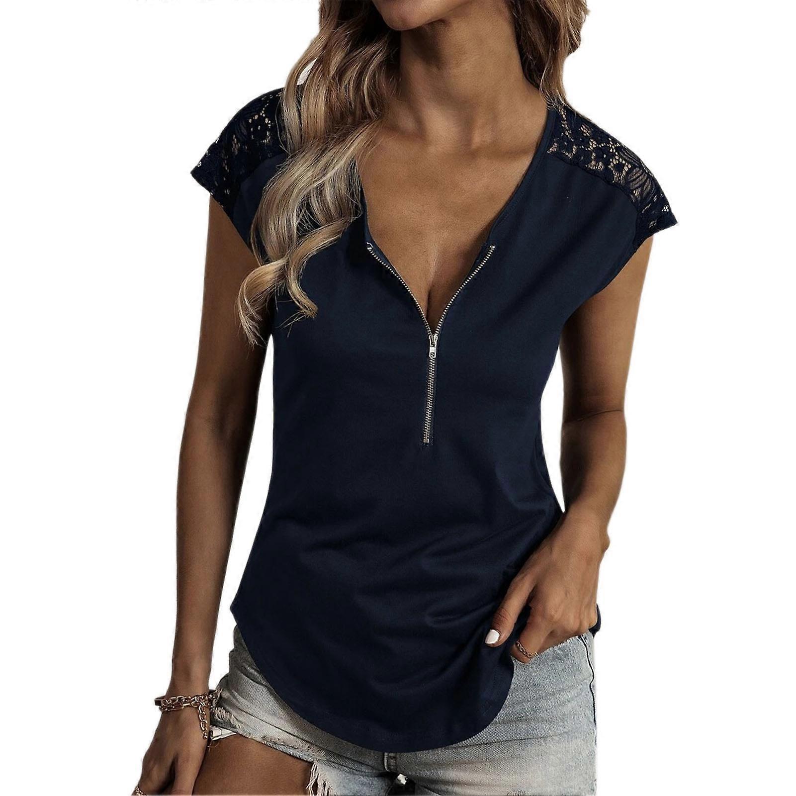 1、Front Zipper Design: With the front zipper design, you can zipper the zipper up as a round neck top or zip it down as a V neck to show off your charming collarbone. 2、Lace Crochet: The shoulders have a hollow lace floral pattern, making the original monotonous top more elegant, retro and casual, showing your unique taste in dress. 3、For Various Scenes: Whether you are attending a party, going on a date, or just running errands, this lace splicing top is the perfect choice. Suitable for casual scenes. 4、Easy to Maintain: Women Short sleeve top is machine washable, making it easy to clean and maintain. It is non fading and durable, ensuring long lasting wear. 5、Comfortable: Crafted from lightweight and soft materials, this top offers a comfortable wearing experience. It feels gentle against the skin and allows for easy movement. Item Type: Women Top Material: 60% polyester, 35% cotton, 5% polyurethane. Washing Method: Machine wash Size: Approx. S: Bust: 92cm / 36.2in, Back Center Length: 68cm / 26.8in, RU Size: 44 M: Bust: 97cm / 38.2in, Back Center Length: 69cm / 27.2in, RU Size: 46 L: Bust: 104cm / 40.9in, Back Center Length: 70cm / 27.6in, RU Size: 50 XL: Bust: 112cm / 44.1in, Back Center Length: 71cm / 28in, RU Size: 56 XXL: Bust: 120cm / 47.2in, Back Center Length: 72cm / 28.3in, RU Size: 58 1 x Top