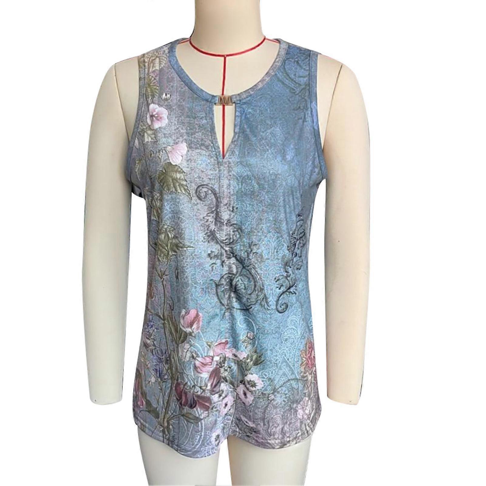 Women Round Neck Tank Top Cutout Bust Front Button Floral Printing Summer Sleeveless Vest for Daily Wear