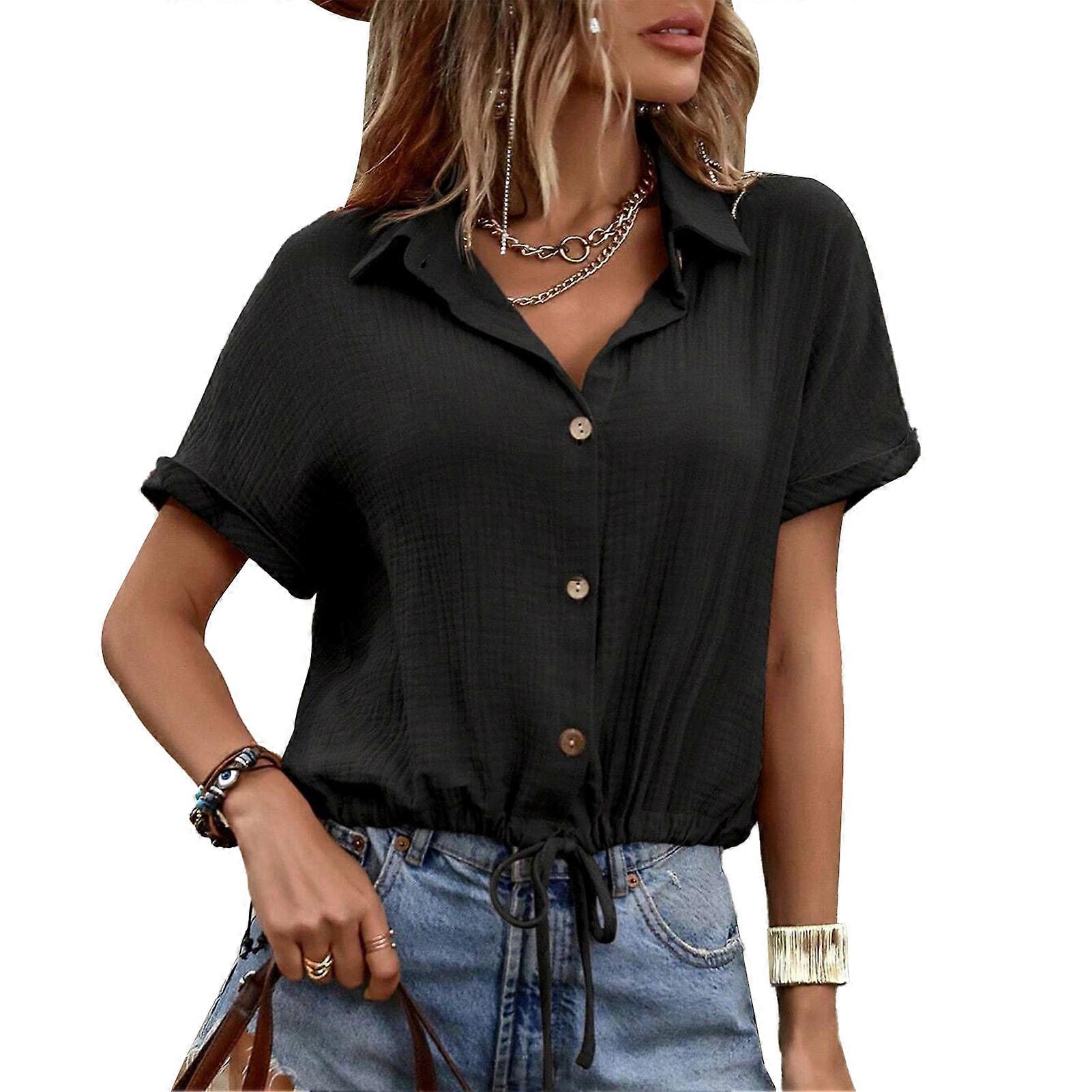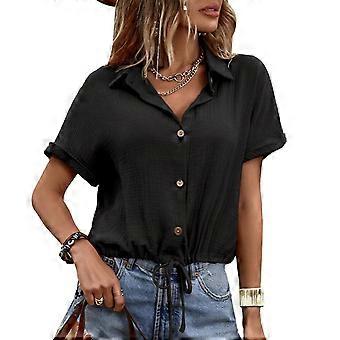 Women V Neck Button Up Shirt Short Sleeve Tie Drawstring Hem Solid Color Casual Loose Summer Shirt
